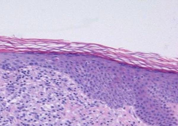 Op de handpalmen en voetzolen is er normaal sprake van compacte orthokeratose.