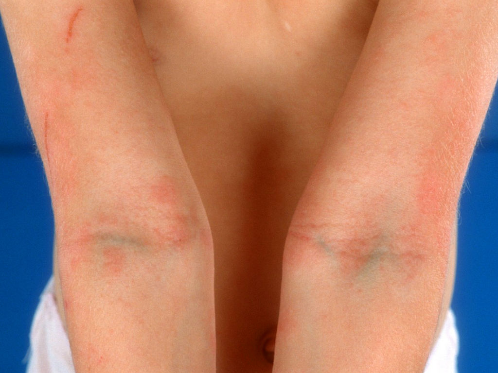 When atopic eczema develops in a baby, it is mainly found on the face and behind the ears, on the scalp, the trunk, and the arms and legs. It usually appears around the third month of life. In toddlerhood, the eczema is mainly found in the skin folds around the joints, such as the elbows, knees, wrists, and ankles. The eczema also often persists in the neck. After the age of 10, the hands, feet, and the inner elbows and knees are primarily affected. In some adult patients, the eczema is mainly present on the face (eyelids, upper lip), and the neck.