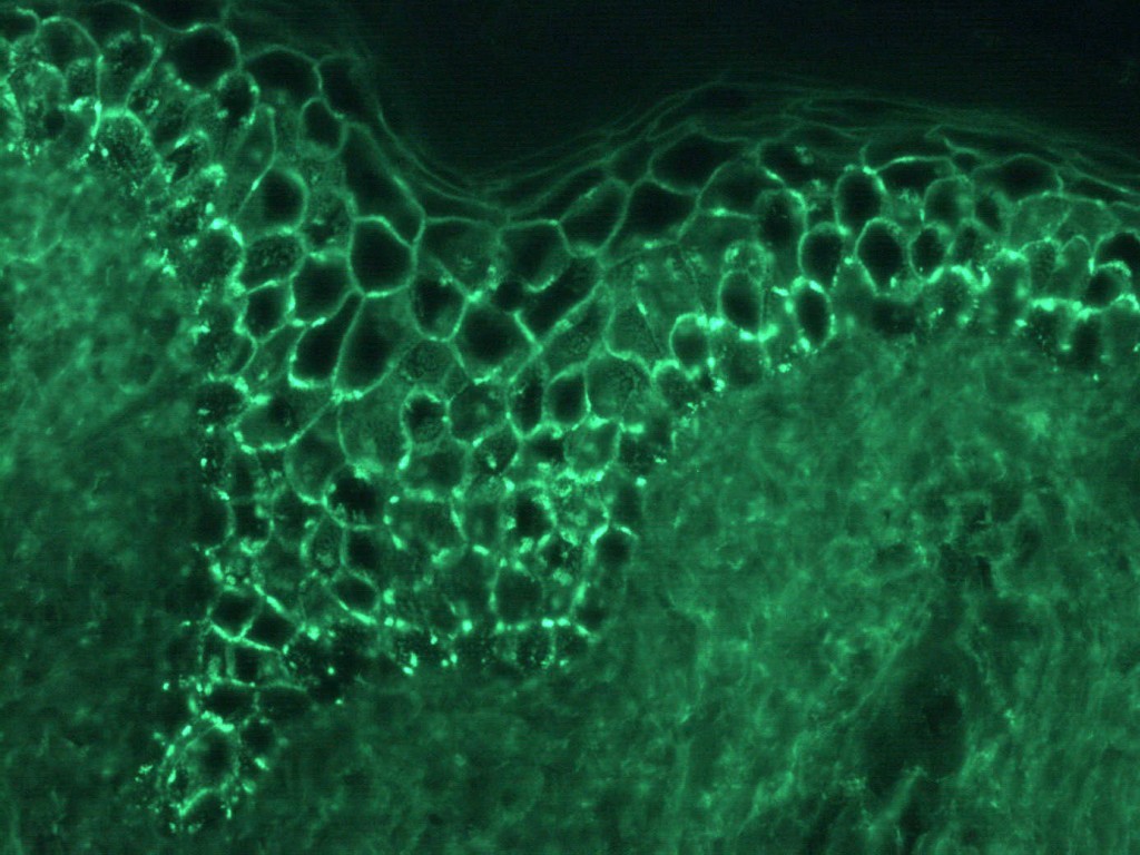 ![Immunofluorescence in pemphigus vulgaris (click on photo to enlarge) [source: www.huidziekten.nl] Immunofluorescence in pemphigus vulgaris](../../images/pemphigus-IF-1z.jpg) |