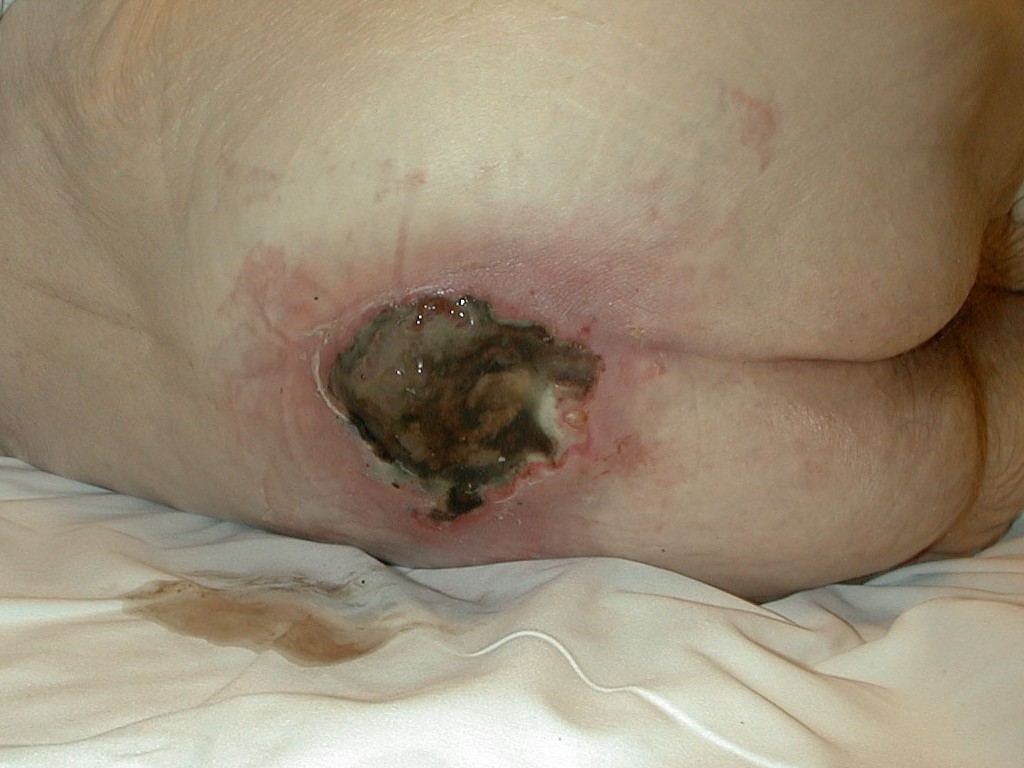 ![Grade 4 pressure ulcer (deep necrosis extending to vital structures) (click on photo to enlarge) [source: Lifecare Medical Training] Grade 4 pressure ulcer (deep necrosis extending to vital structures)](../../images/decubitus/decubitus-graad-4-1z.jpg) |