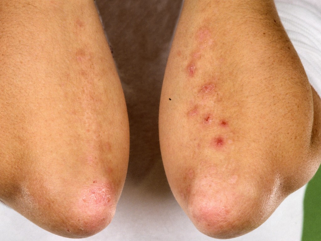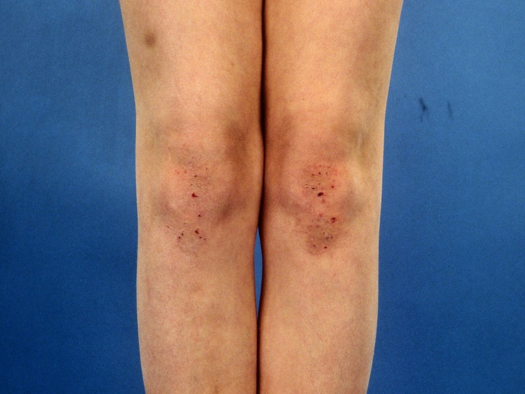 WHAT DOES DERMATITIS HERPETIFORMIS LOOK LIKE?Classically, one sees clusters of clear blisters and red bumps and spots on the forearms near the elbows, or on the knees. It can also occur on the shoulders, lower back, buttocks, or scalp. Because it is intensely itchy, the areas are often scratched, resulting in sores, scabs, and scratched-open itchy bumps. As a result, blisters are often no longer visible during a visit to the dermatologist, making it more difficult to diagnose the condition.