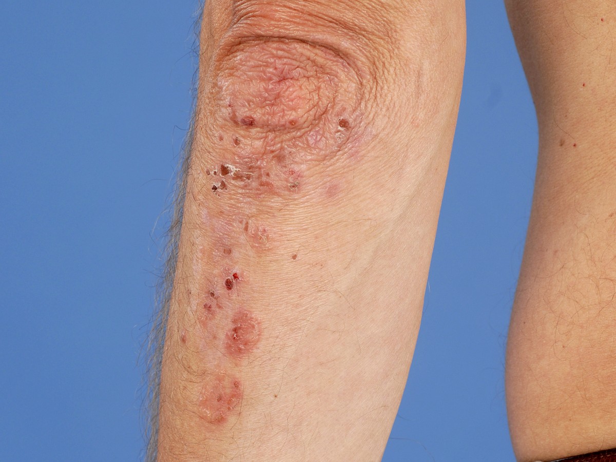 Besides gluten, some patients also appear to have a sensitivity to iodine in certain foods. Excessive iodine intake can worsen symptoms. Iodine is found in salt, among other things.WHO CAN GET DERMATITIS HERPETIFORMIS?The condition is rare, affecting approximately 1 in 10,000 people. Men are twice as likely to have it as women. It usually begins before the age of 40. It can also occur in children (ages 2-7), but this is rare. It is primarily seen in Europeans. It can run in families; sometimes a family member has celiac disease.HOW IS THE DIAGNOSIS MADE?Dermatitis herpetiformis is a rare skin disease, and the diagnosis can be difficult. The combination of itching and lesions around the elbows is a clue, but there are numerous other itchy skin lesions that resemble it. The diagnosis can be confirmed by taking two small skin biopsies. Under the microscope, a special staining technique reveals the deposits of antibodies (immunoglobulin type A) in the skin. These IgA antibodies are found both in the skin and in the intestines and are the cause of the symptoms. They can also be detected in the blood.
