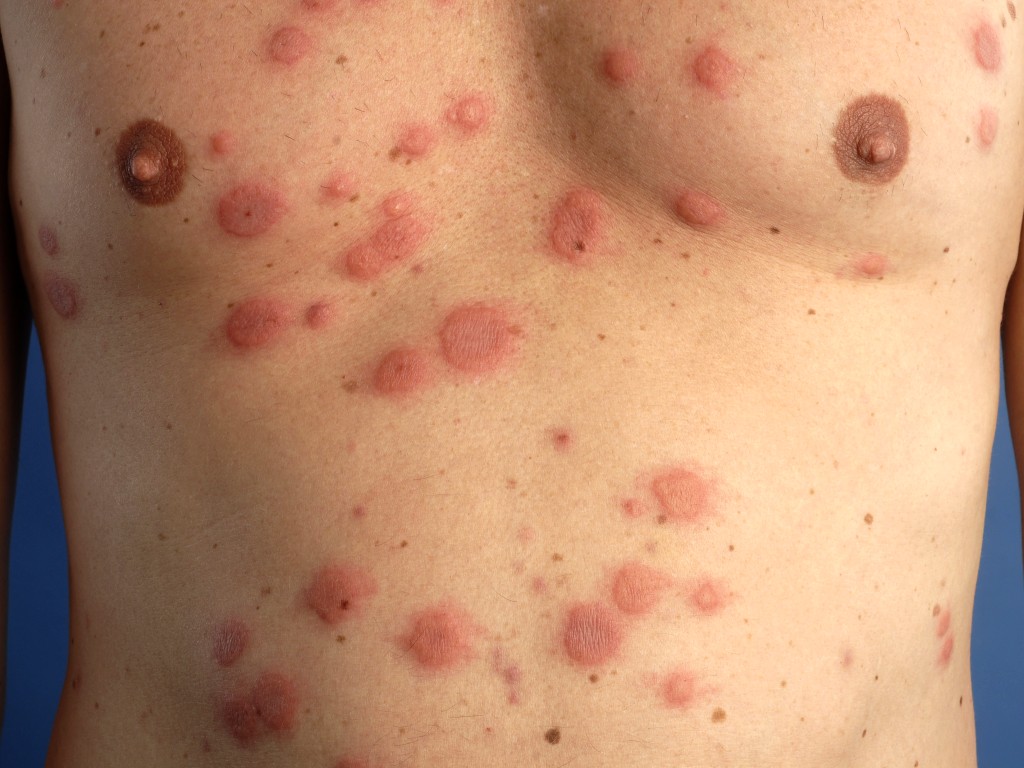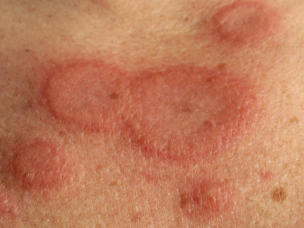 Erythema exsudativum multiforme can be very extensive, involving the mucous membranes (lips, lining of the mouth, eyes). This extensive form was formerly called Stevens-Johnson syndrome. The extensive form with mucous membrane abnormalities is now called erythema multiforme major , and the milder form is called erythema multiforme minor .WHAT IS THE CAUSE OF ERYTHEMA EXSUDATIVUM MULTIFORME?As mentioned, the main causes are infections with the herpes simplex virus or Mycoplasma pneumonia. Cold sores (herpes simplex) are the most common, but the form of herpes transmitted through sexual contact (genital herpes) can also cause erythema multiforme. Mycoplasma is a bacterium that can cause infections of the lungs and respiratory tract. In addition, many other viral, bacterial, and fungal infections can cause erythema multiforme. In about half of the cases, no underlying cause can be found. The erythema multiforme may develop spontaneously, or there may have been an infection, such as a viral respiratory infection or a stomach flu, but the virus has already disappeared and can no longer be detected.WHAT ARE THE PHENOMENA?The rash may consist of spots, bumps, hives, so-called "target lesions," or a combination of these. These skin lesions are red and 1-3 cm in size. They are mainly found on the hands, wrists, feet, elbows, and knees. Target lesions are characteristic of erythema multiforme. These are round lesions with three zones: a dull red or purple center (possibly with a small blister within it), a surrounding area that is lighter in color and slightly raised, and a sharply defined red ring around that. For several days, new skin lesions appear in attacks, which disappear after 1 to 2 weeks. Erythema multiforme can occur at any age. Usually, the condition is not serious and the patient does not feel ill. It resolves on its own.
