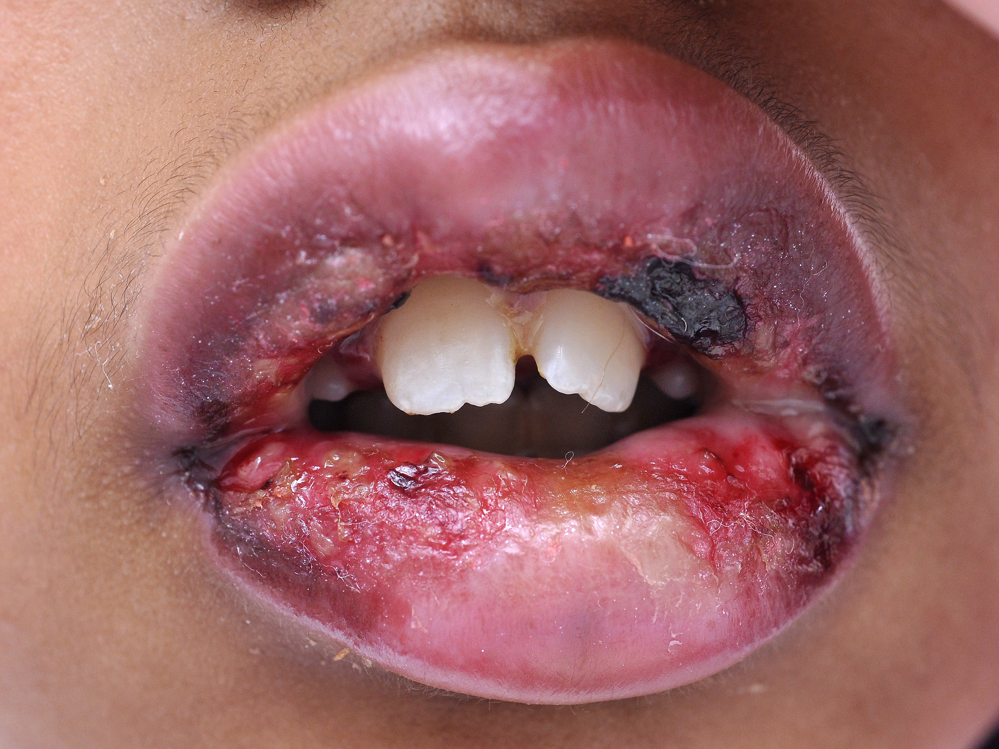 Sometimes there are only a few skin lesions (a minor form), and sometimes the rash is very extensive and also affects the mucous membranes (lips, inside the mouth, and sometimes also the eyes or genitals). With the extensive (major) form, patients can also be very ill. If the mouth is damaged, eating and drinking becomes difficult.
