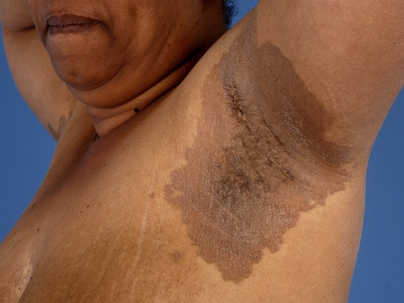 HOW DOES ERYTHRASMA OCCUR?Erythrasma is caused by a bacterium called Corynebacterium minutissimum . This bacterium is found on everyone's skin; it's a normal resident. However, under certain conditions, such as in a warm and moist skin fold, the bacteria proliferate, resulting in so many on the skin that irritation develops, resulting in redness and a brown discoloration.WHAT ARE THE COMPLAINTS?Erythrasma causes few symptoms. The most noticeable symptom is the red discoloration, and sometimes brown discoloration. Brown discoloration is particularly common in people with darker skin. The skin may also itch, feel slightly burning or irritated, or flake slightly. Cracks may also develop. Erythrasma always occurs in the folds of the body, where the skin is moist and lies together. It is most common in the groin, on the inner thighs, and on the scrotum. It can also occur in the armpits. In women, it can appear under the breasts. Sometimes it occurs in the fold of the buttocks.WHO CAN GET ERYTHRASMA?In principle, everyone. But it's slightly more common in older people. Obese people are more likely to develop erythrasma because they have more skin folds that are touching each other. Patients with diabetes also suffer from it more often, as they are more susceptible to skin infections. Patients who suffer from excessive sweating are also more likely to experience it, and erythrasma is also more common in warm and humid conditions, such as working in greenhouses or living in the tropics. It's also seen more often in people who don't take much care with their personal hygiene.HOW IS THE DIAGNOSIS MADE?The diagnosis is based on the clinical picture and its appearance. There's a test to determine whether the bacteria that cause erythrasma ( Corynebacterium minutissimum ) are present in excessive numbers on the skin. By illuminating the skin with ultraviolet light (UVA, black light), an orange color is created. It's the bacteria that glow orange. The UVA lamp used for this is also called a Wood's lamp, after its inventor. The room must be darkened to see clearly.