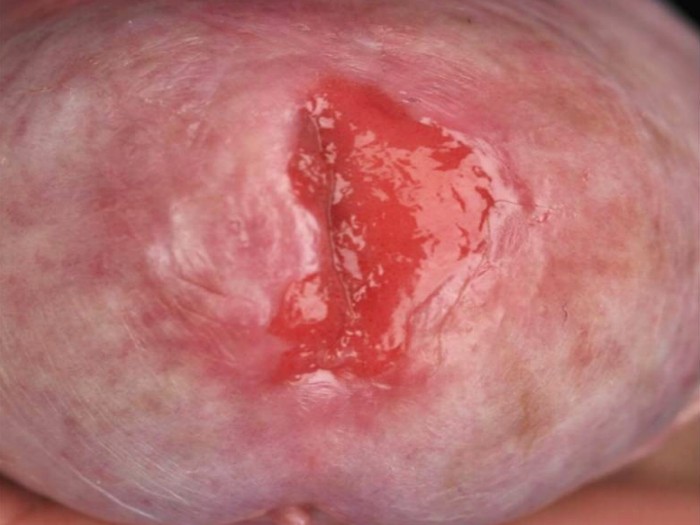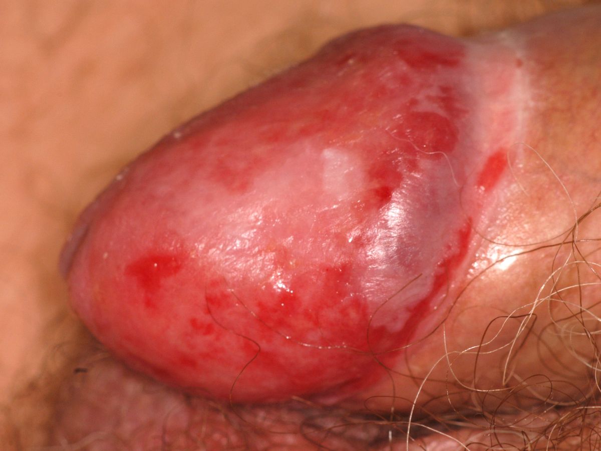 WHAT IS QUEYRAT'S ERYTHROPLASIA?Erythroplasia of Queyrat is a superficial form of skin cancer on the penis, usually the glans. It appears as a red spot. It is named after a French dermatologist, Louis Queyrat, who first described it. It occurs primarily in men over 40. It is less common in circumcised men than in uncircumcised men. Erythroplasia of Queyrat can be considered a developing squamous cell carcinoma. If left untreated, approximately 30% develop into squamous cell carcinoma.WHAT DOES ERYTHROPLASIA DE QUEYRAT LOOK LIKE?Erythroplasia of Queyrat is a sharply defined, bright red, shiny (or velvety), often slightly thickened area on the penis, usually on the glans penis, sometimes on the inside of the foreskin. The area causes no symptoms or pain. Later, the area can break down and develop scabs and ulcers. It is often confused with a yeast infection, eczema, or psoriasis, and is treated accordingly.