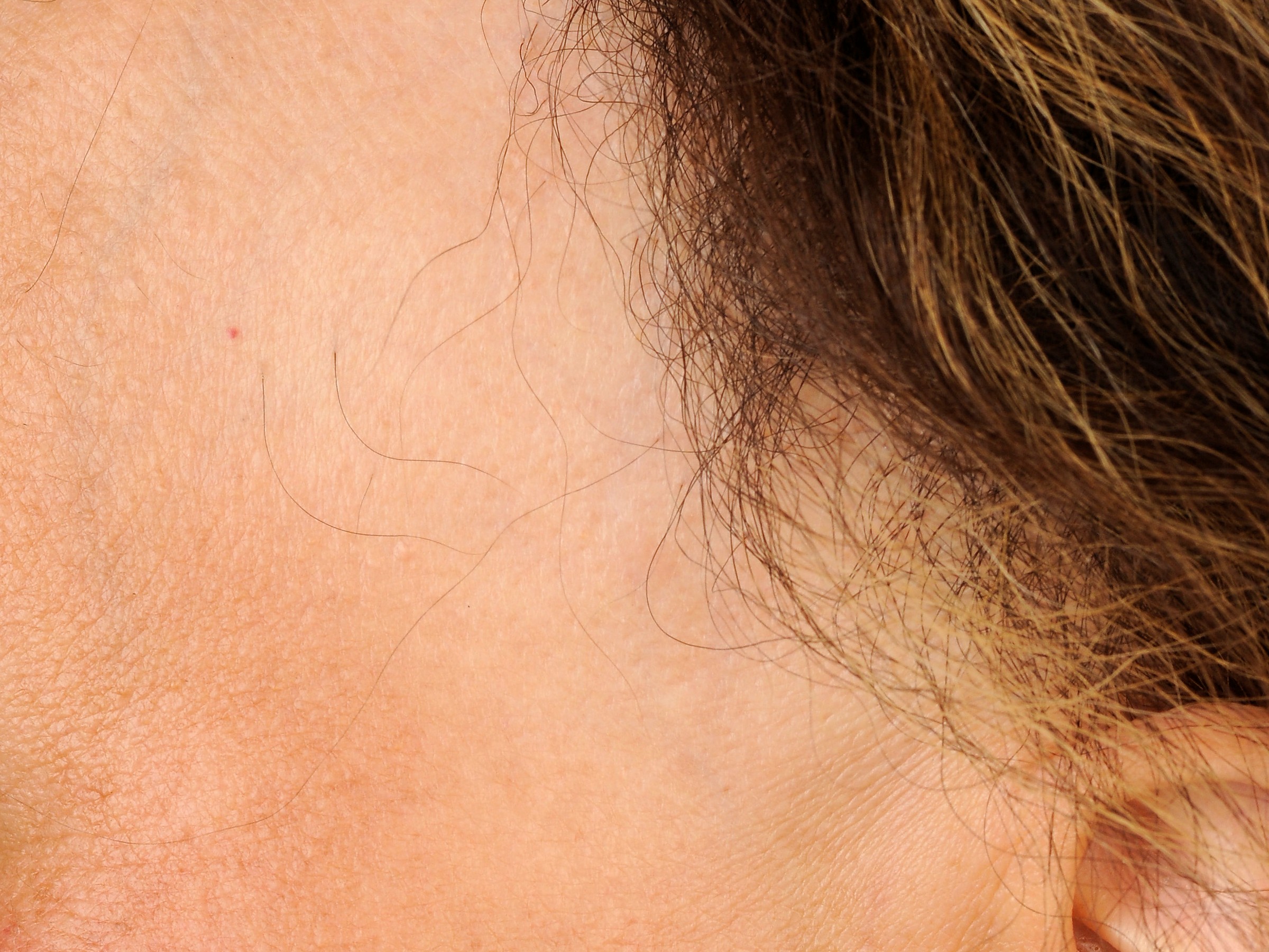In frontal fibrosing alopecia, the hair along the front hairline and at the temples falls out at a slow pace, causing the hairline to gradually recede. This reveals a strip of skin that is lighter in color than the rest of the forehead, with little pigment and no sun damage. This is because this area of skin was always protected from sunlight by the hair. Sometimes there is a single hair left in this area, known as a 'lonely hair'. The eyebrows can also fall out, often starting at the outer edges.