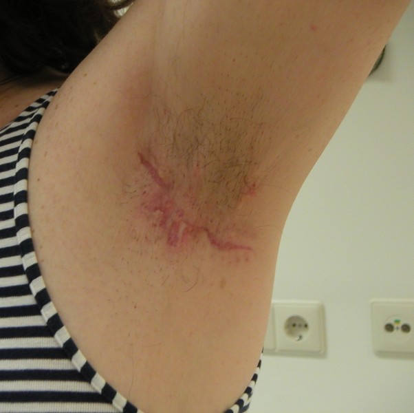 ![Surgery of the fistula area in hidradenitis suppurativa (click on photo to enlarge) [source: www.huidziekten.nl] Surgery of the fistula area in hidradenitis suppurativa](../../images/hidradenitis/HS-excisie-oksel-3z.jpg) |