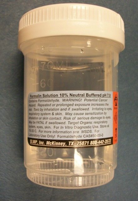 The container of formalin is delivered to the pathology lab. There, they slowly replace the formalin the sample is floating in with another liquid, usually alcohol. The pathology lab has equipment that slowly rotates the sample, gradually increasing the amount of alcohol and decreasing the amount of formalin in the containers.