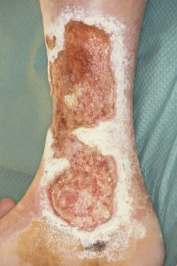![A wound that is still largely covered with yellow dead tissue (click on photo to enlarge) [source: www.huidziekten.nl] A wound that is still largely covered with yellow dead tissue](../../images/dd-ulcera/geelz.jpg) |