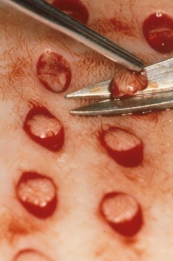 Circles of 4 mm diameter are removed from the anesthetized area. Circular holes are punched out with a kind of apple corer (English: punch). That's why it's called a punch graft. These rounds are removed with scissors and tweezers and placed loosely on the wound in a regular pattern. During the procedure, you must keep your leg still and avoid any sudden movements. A fatty gauze is then applied, followed by a layer of gauze, followed by a bandage and a protective bandage. This must remain in place for five days. The area from which the rounds were removed is thoroughly cleaned and then bandaged with a sterile dressing. This dressing should remain in place for as long as possible (it will fall off naturally once the wounds have healed).