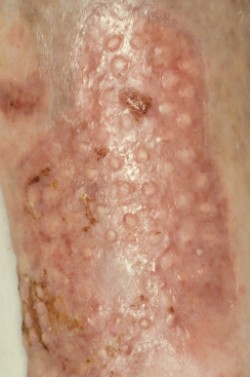 After the 4-5 days, the bandage is removed, starting with the top layers. Then, the bottom layers are thoroughly moistened. This is left to soak in for fifteen minutes. Then, the bandage is completely removed. After 5 days, the transplanted skin circles will have grown to the underlying layer. Some are not attached and remain stuck to the bandage. These have not survived; it's okay if a few fall off. When unwrapped after 5 days, a wound may look dirty, sometimes pus-filled and foul-smelling, and the skin biopsies may look pale, as if they won't survive. However, don't judge too hastily; after a few days, they will often be a nice pink color again. After unwrapping, a new layer of gauze is placed on the transplanted wound, and moist gauze is placed over this. The gauze is changed once a day, the moist gauze three times a day. This continues until the wound has (almost) healed, after which it is bandaged dry (gauze + dry bandage). After unwrapping, bed rest is lifted. However, patients with an open leg who would develop fluid in their legs without support stockings should not get out of bed without a stocking or pressure bandage around them.QUESTIONS ABOUT THE PUNCH GRAFT SKIN TRANSPLANTDo the wounds on the thigh heal properly?