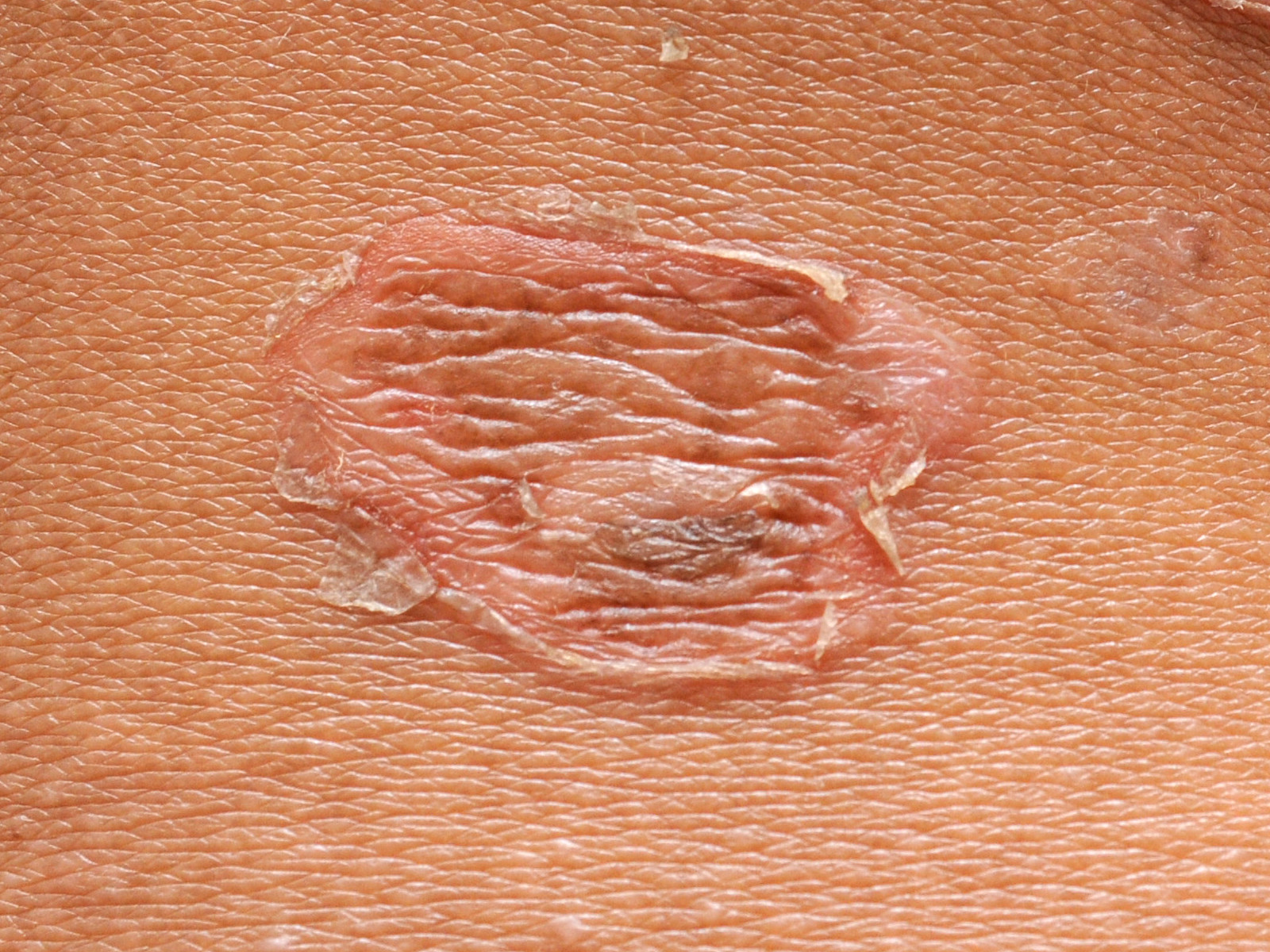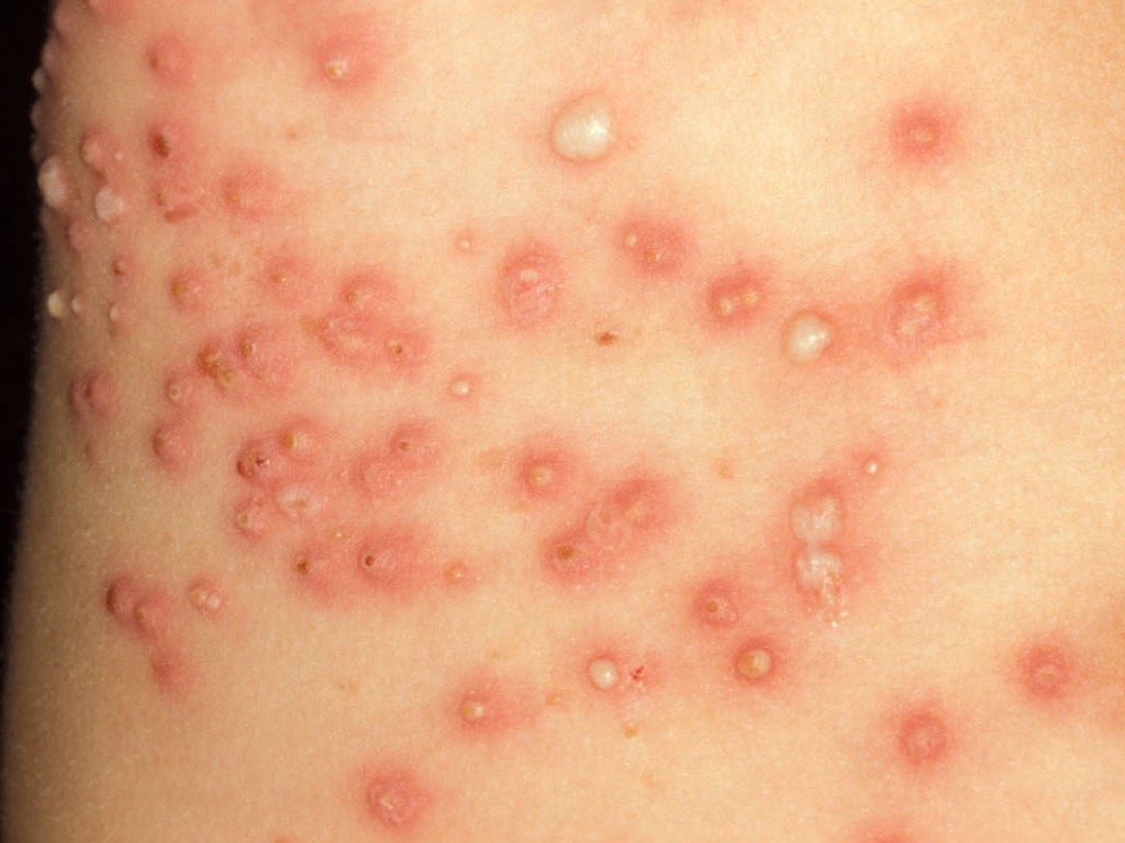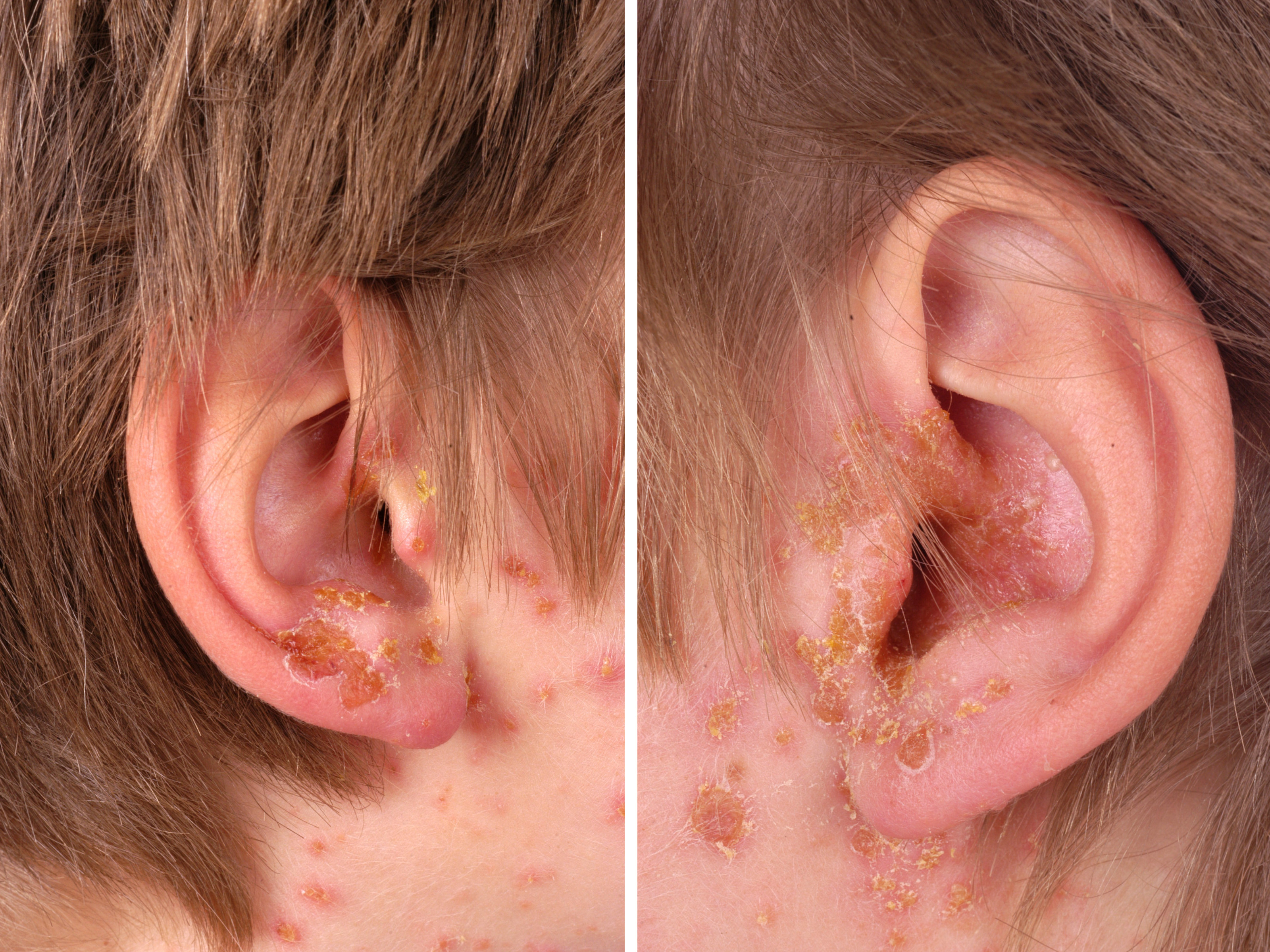 Impetigo is more likely to develop if the skin is damaged. For example, the skin under the nose of a child with a cold and a runny nose can be irritated and damaged. Atopic eczema also increases the risk of impetigo. And after chickenpox, for example: the chickenpox virus causes blisters and open wounds, which can subsequently become infected with staphylococcus bacteria. Insect bites, abrasions, and wounds from scratching can also become infected with staph. Scratching an itch can spread the bacteria to other areas.WHAT ARE THE SYMPTOMS, WHAT DOES IMPETIGO LOOK LIKE?Impetigo causes superficial skin lesions, such as abrasions or small blisters that break easily. Fluid leaks from the abraded areas or blister bases, which dries out into a yellowish (honey-yellow) or brownish crust. The skin is often light red. The crusts can become larger. Over time, the crusts dry up and fall off on their own. The skin underneath remains red for some time but eventually heals without leaving scars.