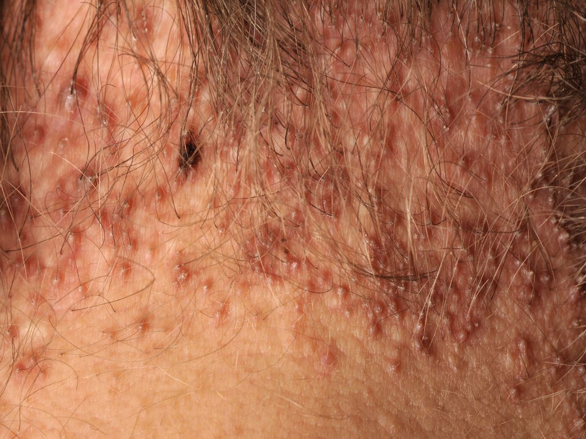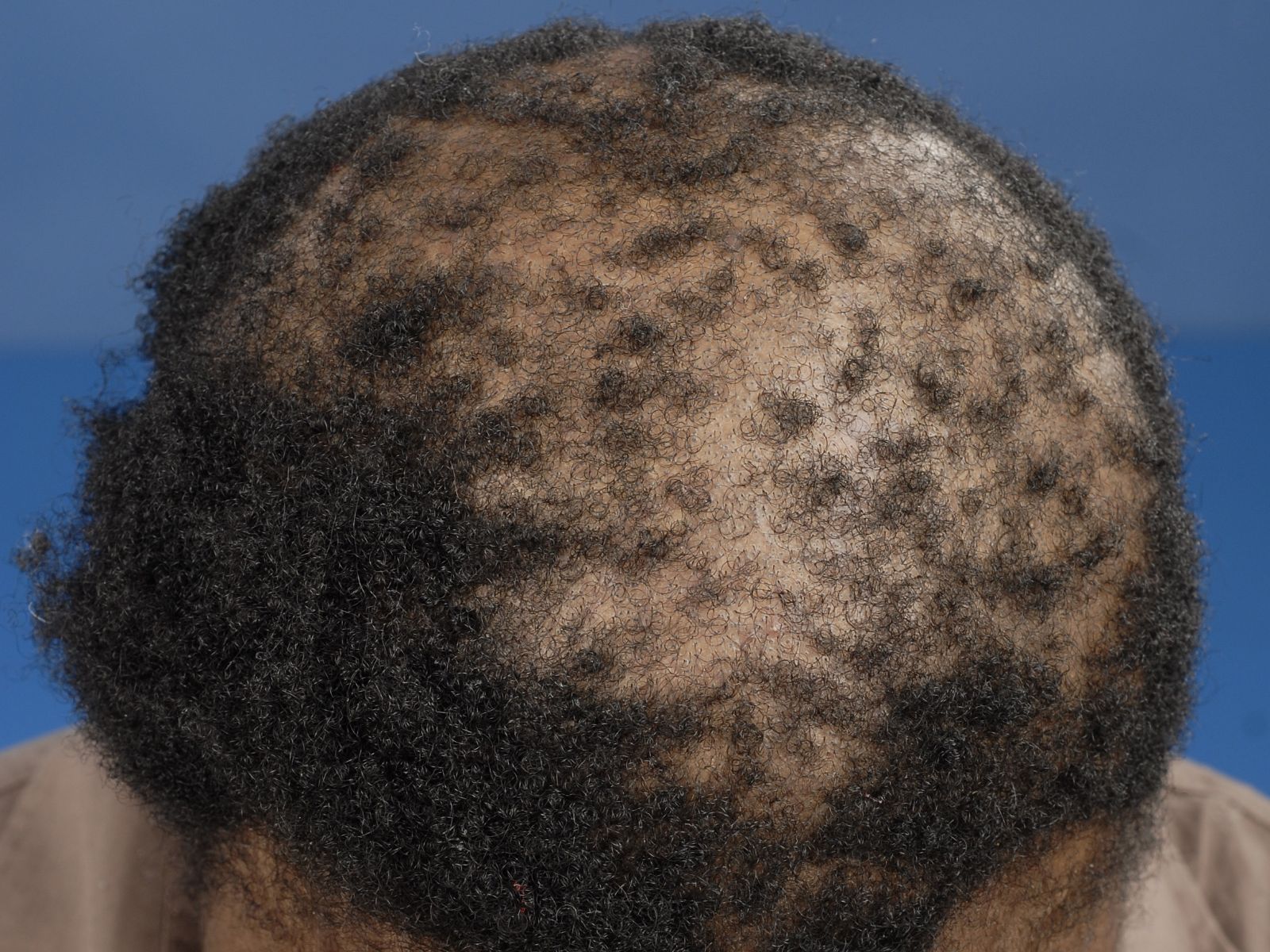 Gradually, more and more bald patches appear on the scalp. It often starts in the middle of the top of the head and spreads to the edges. But in principle, it can occur anywhere on the scalp. The eyebrows can also fall out, often starting at the outer edges. During the active phase of the disease, the affected areas may itch or feel burning. Small reddish-brown bumps and flakes may also be seen around the hairs. In a later stage, scarring of the hair follicles occurs. Eventually, completely bald patches develop, in which no hair follicle openings can be seen. Sometimes a few hairs remain. The speed at which this process progresses varies from person to person, and its course is unpredictable.
