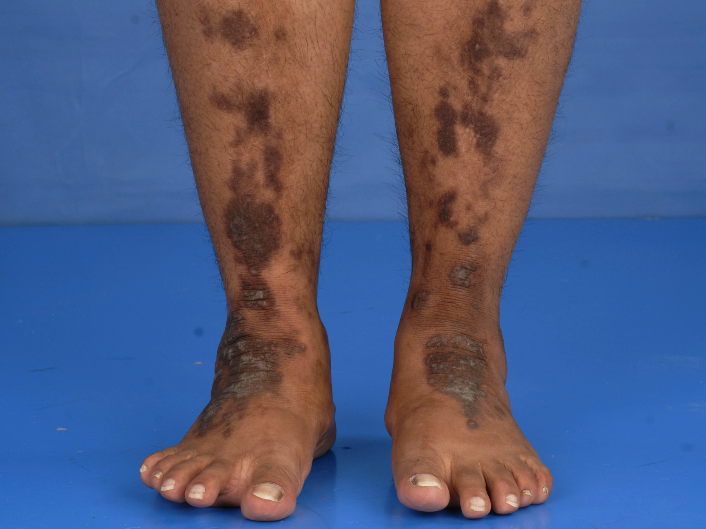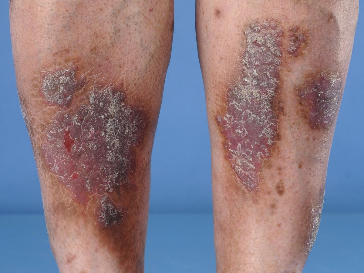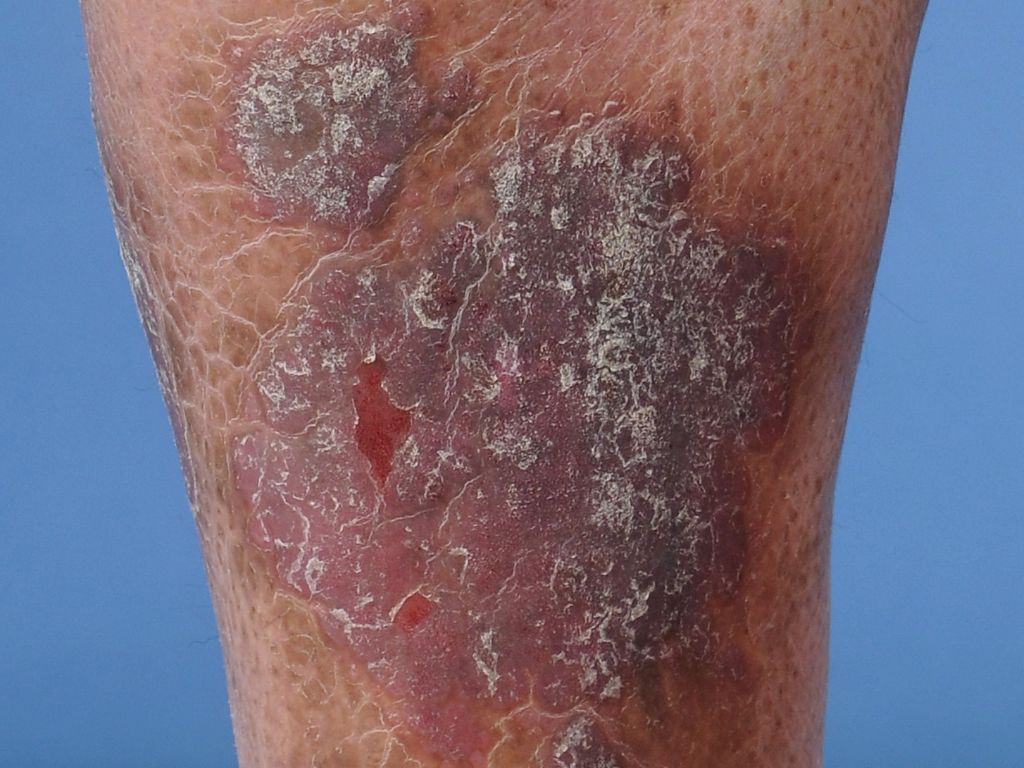 Lichen simplex chronicus is the medical term for an intensely itchy patch of skin, often on the lower legs. It is caused by repeated scratching of the same area. The excessive scratching causes the skin to become thicker, harder, and often darker in color, especially in people with darker skin. Scratching is usually an unconscious and uncontrollable response to the itching. The itching is often worst at the end of the day and when at rest (when there are no other distractions). People also scratch the areas unconsciously at night while sleeping. Chronic scratching sometimes becomes a habit. Emotions, stress, and psychological factors also influence scratching behavior. Lichen simplex chronicus occurs without other skin diseases being present, but it also occurs in patients who have an itchy skin disease such as atopic eczema, dry skin, or psoriasis. It also occurs in patients who experience itching all over their body.