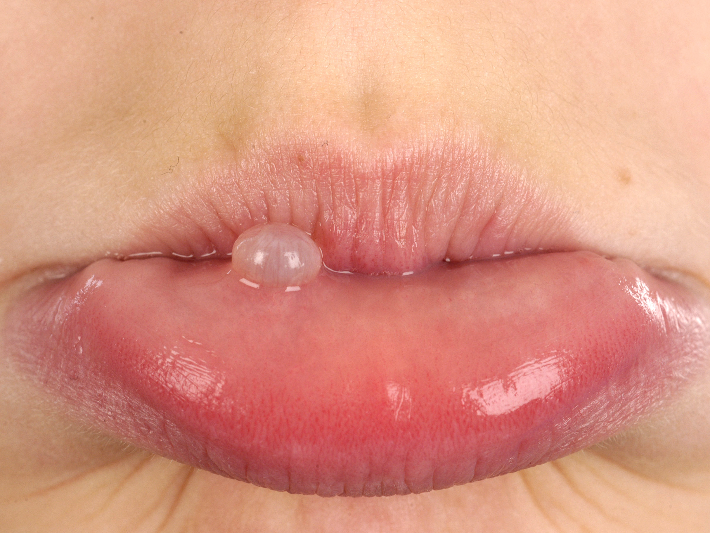 WHAT DOES A MUCOCELE LOOK LIKE?A round, painless bump, usually on the lower lip. Its size varies from a few millimeters to 1.5 cm. It is filled with a mucosal substance (saliva), which may have a bluish tint. If the cyst ruptures, a yellowish or clear, viscous, mucosal substance is released. Sometimes the mucocele is bitten open or breaks open on its own and disappears, but it can also recur. Besides the lower lip, a mucocele can also appear on the floor of the mouth (in which case it is called a ranula), on the underside of the tongue, on the inside of the cheek, and on the palate.HOW DOES A MUCOCELE DEVELOP?Small salivary glands are located throughout the floor of the mouth, including the lower lip. They produce the mucus that keeps the oral cavity moist. The salivary duct can become blocked. Sometimes this occurs spontaneously, for no apparent reason, and sometimes it's caused by damage to the mucous membrane where the duct empties.