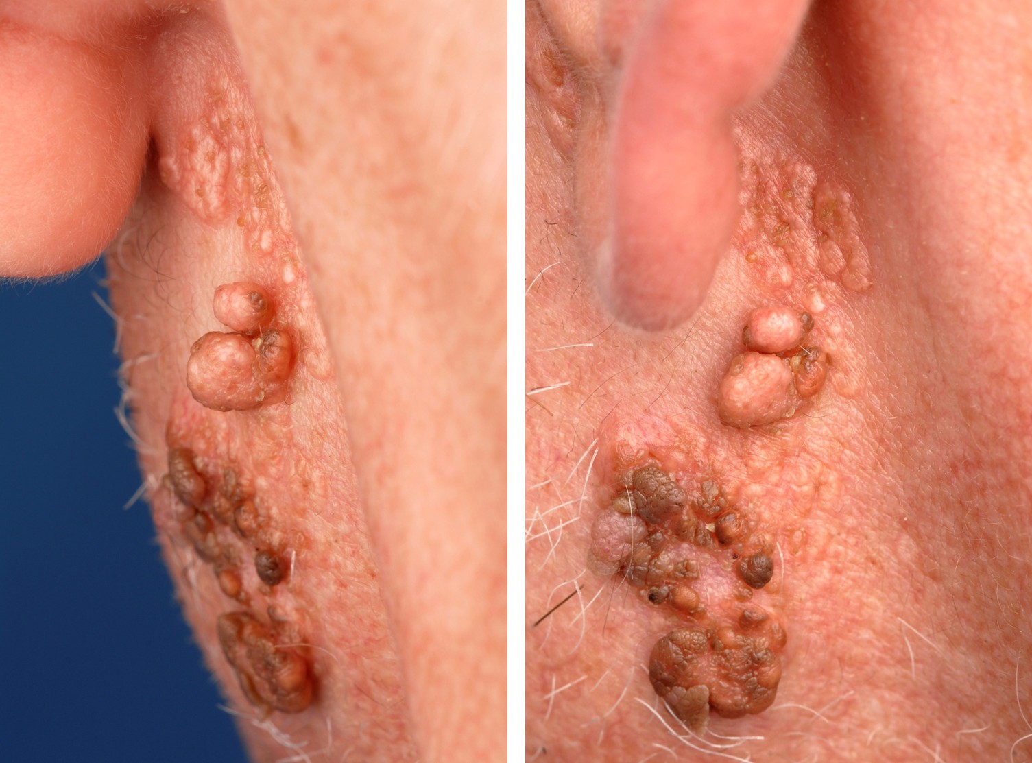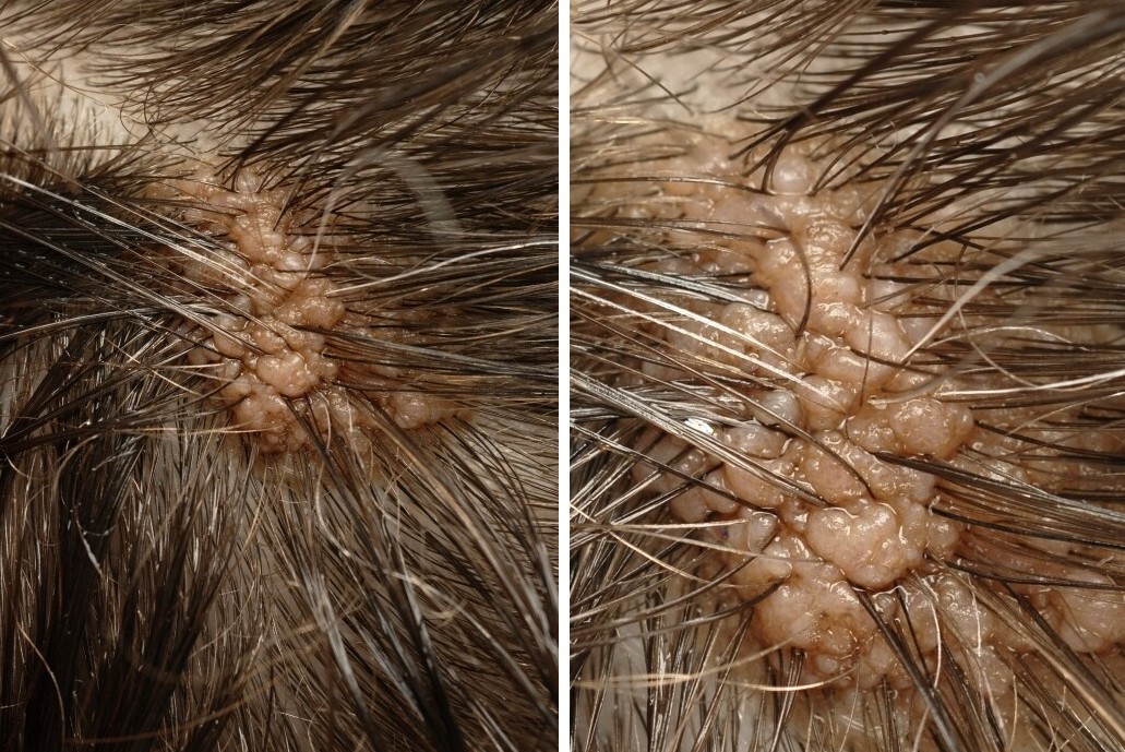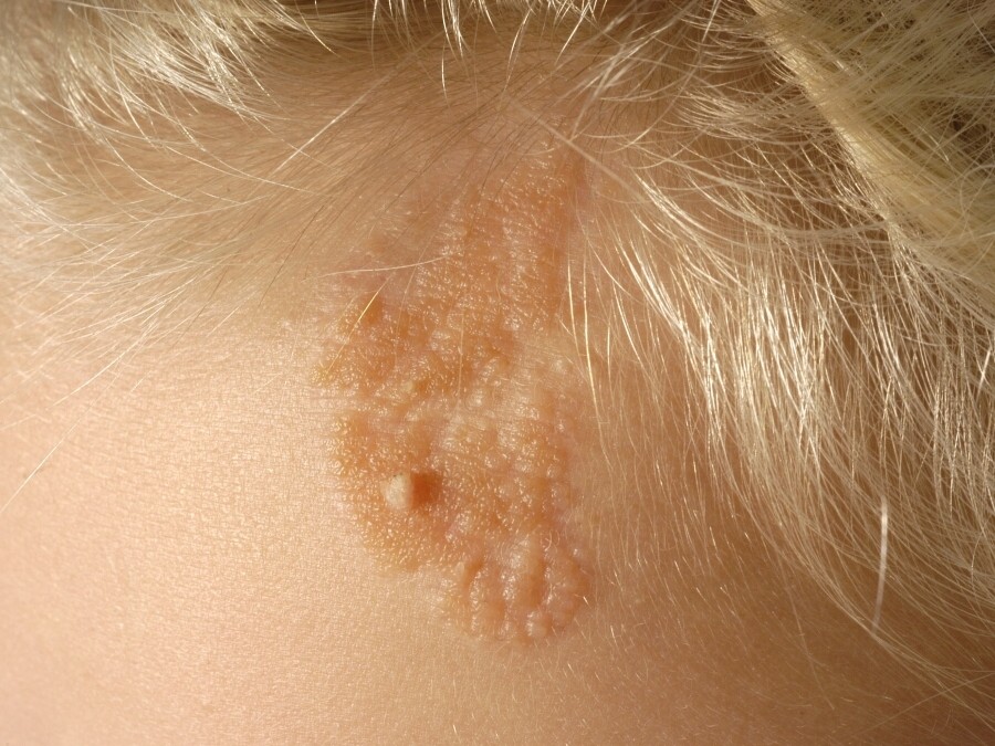 WHAT IS A NAEVUS SEBACEUS?A nevus sebaceus is a wart-like, bumpy birthmark on the scalp, present from birth. The name derives from sebum (oil) because the mark consists primarily of enlarged sebaceous glands. It is a congenital malformation of the sebaceous glands. Sometimes, abnormal hair follicles or sweat glands are also present. A nevus sebaceus occurs in 0.3% of newborns, with equal frequency in both boys and girls. It is a benign condition.WHAT DOES A NAEVUS SEBACEUS LOOK LIKE?A nevus sebaceus is usually found on the scalp (60%), sometimes on the face (30%), in front of the ear (4%), or on the neck (3%). They are usually oval or elongated plaques, yellow-brown or orange, or skin-colored. The surface is bumpy and wart-like. They usually have little or no hair growing on them. There may be just one or several. Their size varies from a few millimeters to several centimeters. They do not increase in size after birth, but they do grow with the child. During puberty, they may become somewhat raised, likely due to hormonal influences.