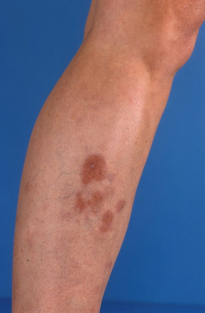 WHAT IS NECROBIOSIS LIPOIDICA?Necrobiosis lipoidica is a harmless skin condition that usually develops spontaneously on the lower legs, particularly at the front of the shin. It's a light brown or yellowish-brown spot, sometimes called applesauce-colored. The skin is also somewhat thin at the site, and a few dilated blood vessels are usually visible. It begins as a small spot, 1 to 2 cm in diameter, and can gradually enlarge. In most people, it doesn't grow larger than about 5 cm in diameter. It's primarily a cosmetic issue. Sometimes the skin around the spot is less sensitive or even numb.
