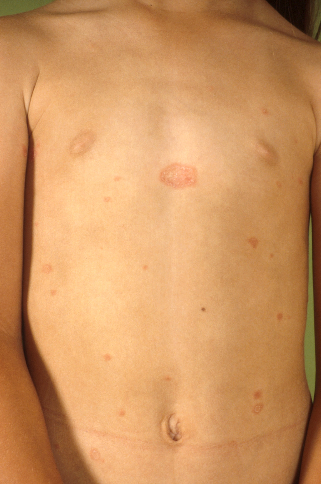 or "plaque-mère"). One to two weeks later, several similar patches, often slightly smaller and oval in shape, appear, primarily on the trunk, upper arms, and thighs. The palms of the hands and soles of the feet are usually spared.