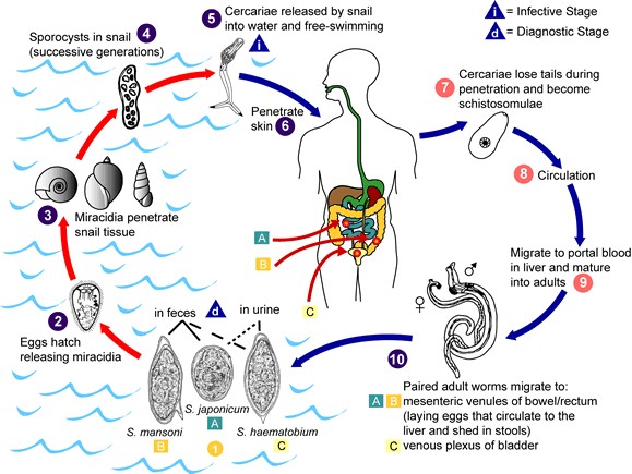 The adult worms reside in small blood vessels of the intestines or bladder. Female worms lay eggs that penetrate the wall of the intestines or bladder and are excreted in the feces or urine. If these eggs end up in fresh (surface) water, a larva hatches and enters certain aquatic snails. The larva develops and multiplies within the snail. New larvae emerge from the snail and swim around in the water. These larvae can penetrate intact human skin. They are carried by the bloodstream and travel via the lungs to the liver, where they mature and from there ultimately reach their final destination: the small blood vessels of the intestines or bladder. The eggs laid by the female can become lodged in the lining of the intestine or bladder, causing damage. Eggs can also be carried by the bloodstream to the liver, and sometimes to other parts of the body. The abnormalities and problems caused by schistosomiasis result from tissue reactions to worm eggs in the organs.