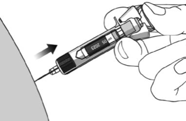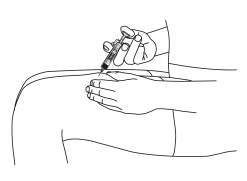 Inject the dose: Hold the pre-filled syringe in one hand between your middle and index fingers and place your thumb on the end of the plunger. With your other hand, gently pinch a small area of clean skin between your thumb and index finger. Do not squeeze too hard. Never pull the plunger back. Insert the needle all the way through the skin in one smooth motion (see figure 4).