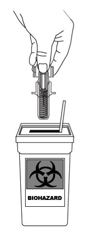 Used syringes should be disposed of in a puncture-resistant container, such as a sharps disposal container (see Figure 8). For your own safety and health and the safety of others, never reuse syringes. Dispose of your sharps disposal container according to local regulations. Disinfectant wipes and other used items can be disposed of in household waste.
