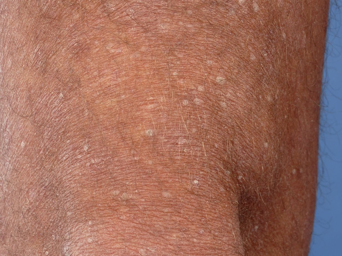 HOW DO STUCCOKERATOSES OCCUR?It's thought that stuccokeratoses develop as a reaction to years of sun exposure, as they often appear on the lower legs. This isn't entirely certain. Stuccokeratoses are also more common in people with dry skin.HOW IS THE DIAGNOSIS MADE?The diagnosis is based on the clinical picture and its appearance. Viral warts, of the flat type, may resemble stucco keratosis. Additional testing, such as a skin biopsy, is rarely necessary.HOW IS STUCCOKERATOSIS TREATED?Stuccokeratosis is a benign condition; treatment is not necessary and, due to the large number of lesions, it is also not easy. If desired, they can be removed by scraping them off with a sharp spoon (curettage), by electrical cauterization (electrocoagulation), or by freezing them off (cryotherapy). Stuccokeratosis can also be removed with a CO2 laser.WHAT CAN YOU STILL DO YOURSELF?You can apply a cream or body lotion to the skin to prevent it from drying out. Moisturizing creams or ointments such as urea ointment can also be used. Stuccokeratoses can be partially removed or smoothed with exfoliation, but they won't disappear completely and may become thicker again.WHAT ARE THE OUTLOOK?Stuccokeratoses don't go away on their own. But they're harmless and don't cause any symptoms. |