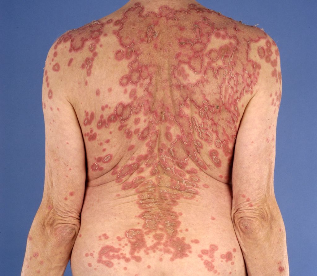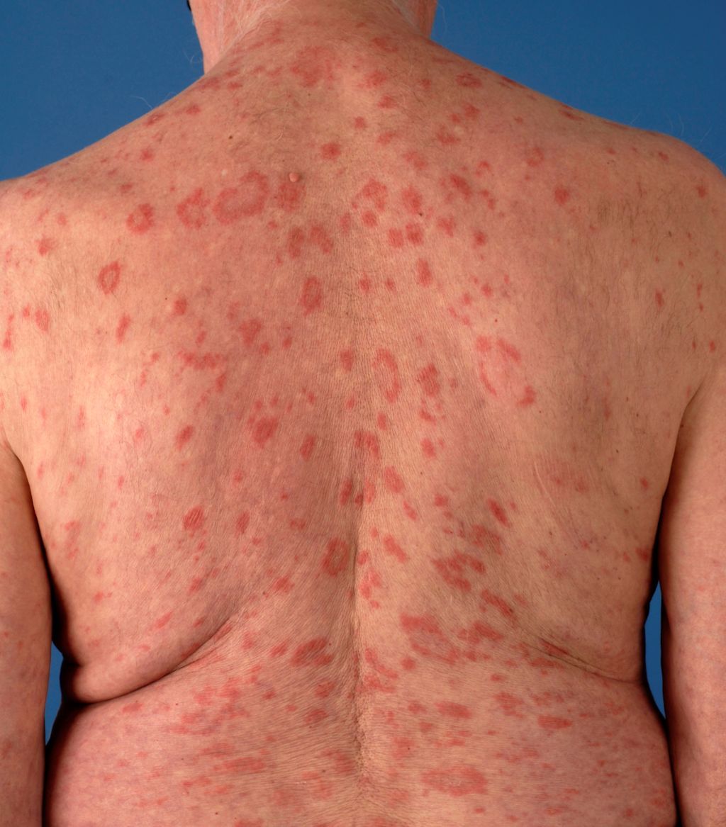 Various skin lesions can develop with lupus erythematosus. Not only SCLE (red, ring-shaped, scaly patches on the trunk), but also CDLE (chronic discoid lupus erythematosus, scaly patches with scarring, especially on the face) and butterfly-shaped erythema (red patches on the face, on the cheeks, in the shape of a butterfly). Other skin lesions can develop with lupus erythematosus, but these are the three most common. The skin lesions are triggered by sunlight. See also the leaflet on cutaneous lupus erythematosus .WHAT DOES SUBACUTE LUPUS ERYTHEMATOSUS LOOK LIKE?Red, circular or ring-shaped patches appear on the body, particularly on the back and chest. These patches may flake and crust over. They can mimic other skin conditions such as psoriasis, eczema, or a drug allergy. The patches gradually increase in size. They can be triggered by sunlight and may disappear spontaneously. However, they are usually a chronic condition, with patches recurring, especially in spring (due to sun exposure). They heal without scarring, though some discoloration may remain.