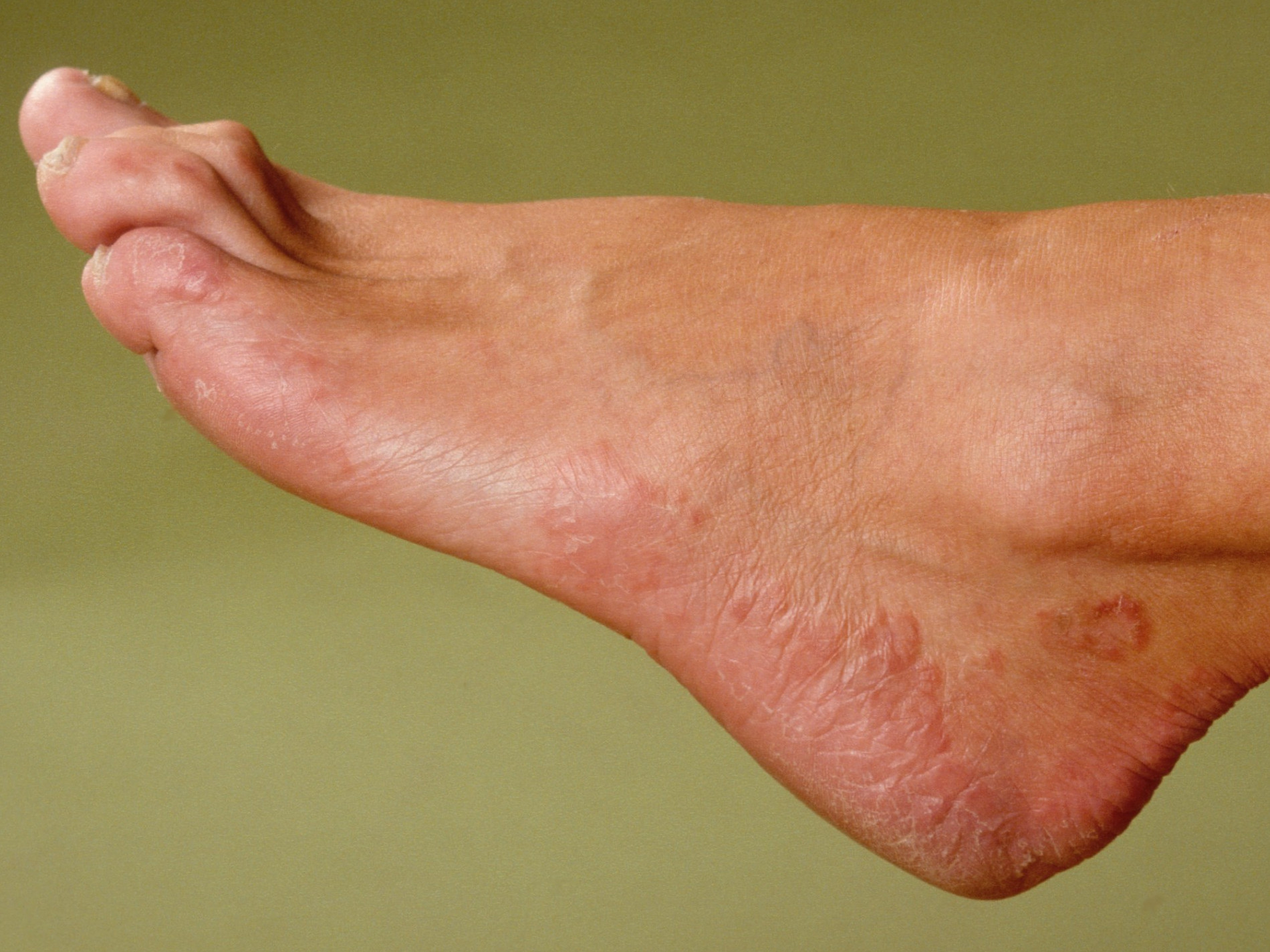 - Redness and flaking of large areas of the soles and edges of the feet.