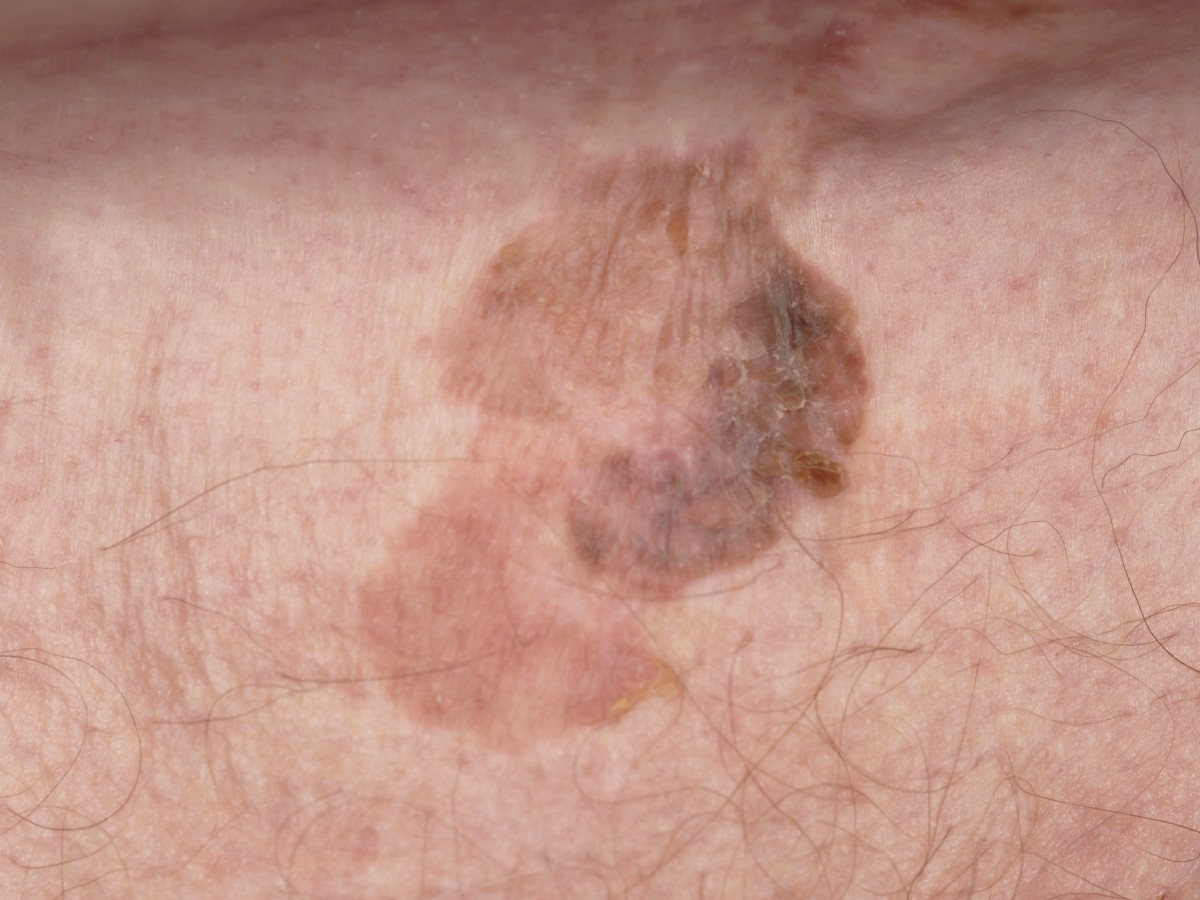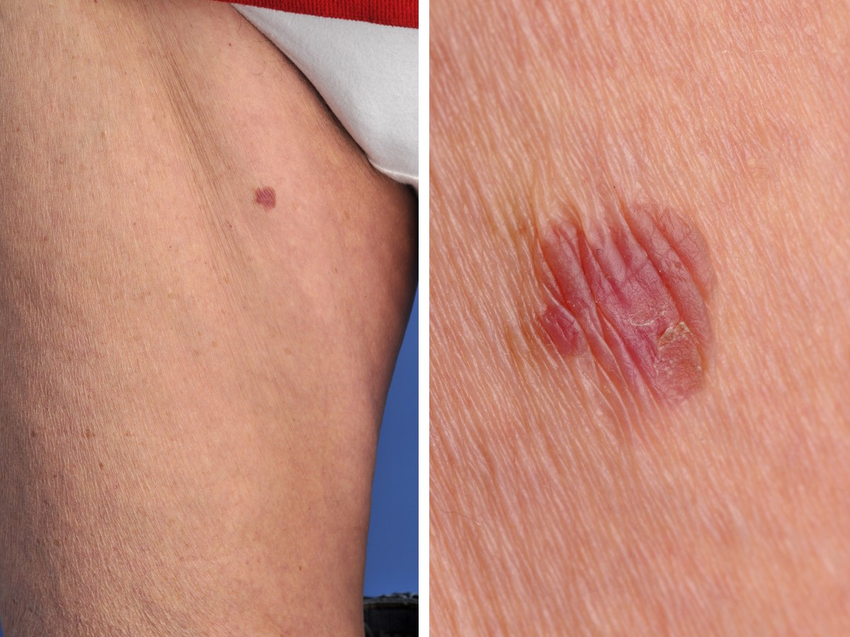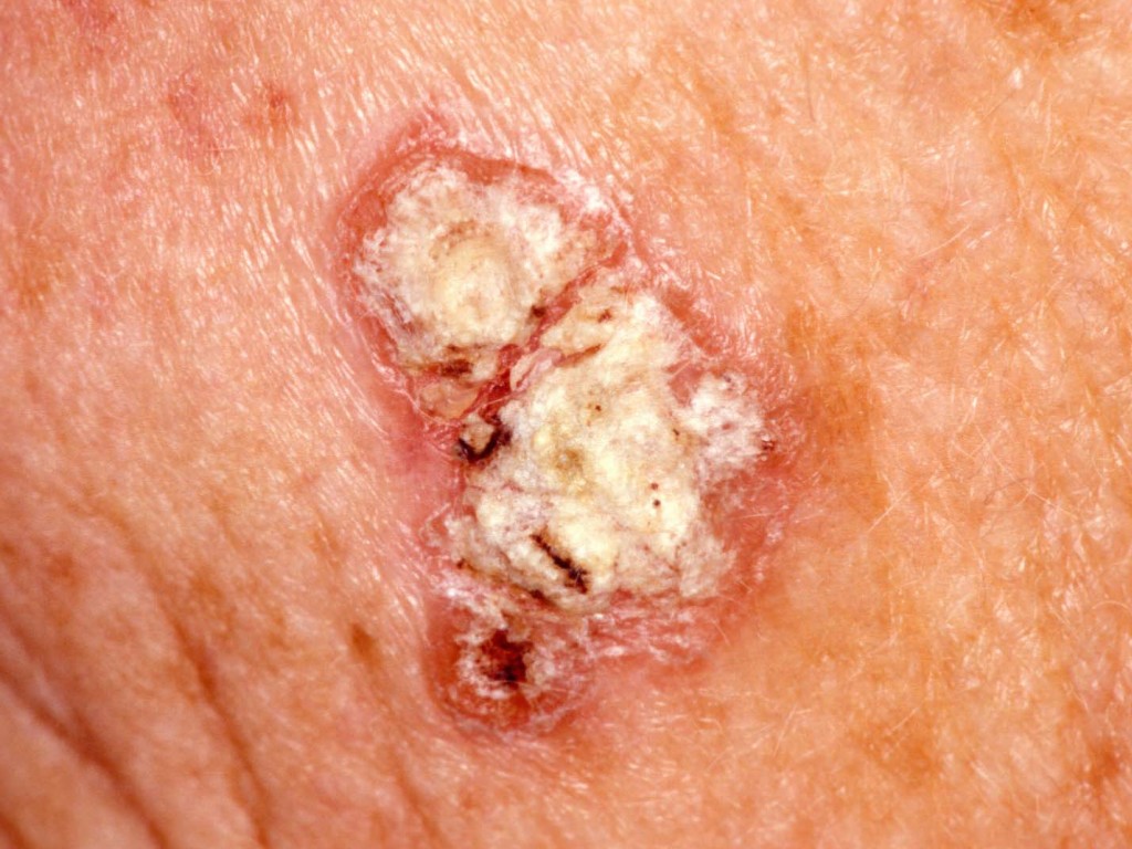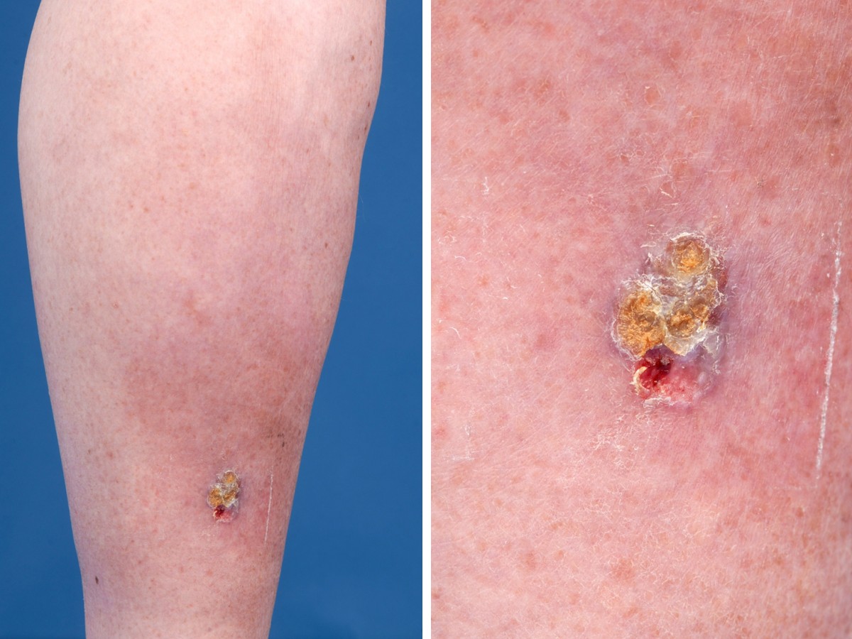 WHAT IS BOWEN'S DISEASE?Bowen's disease is a superficial form of skin cancer. It is an early form of squamous cell carcinoma . The disease is named after the physician who first described it. It usually involves a single, red, scaly patch that slowly enlarges. The patch may resemble a patch of eczema or psoriasis. It is often treated as such, with an anti-eczema ointment, which subsequently proves ineffective. Because it is an early, superficial form of skin cancer, it is not dangerous. It can be removed in various ways.WHAT DOES BOWEN'S DISEASE LOOK LIKE?Bowen's disease is usually a slowly expanding red and scaly patch , resembling eczema or psoriasis. It often has crusts. Sometimes it is partially or completely brown. The patches mainly appear on the lower legs. But it can occur anywhere (face, hands, fingers, on the genitals, around the anus, under and around the nail). Usually, it affects only one patch. In 10-20% of patients, multiple patches are present. This is mainly seen in patients with a compromised immune system (for example, patients with a donor kidney who are taking immunosuppressive drugs) and in patients who have suffered significant sun damage in the past. Bowen's disease mainly occurs in areas that are frequently exposed to the sun, but it can also develop in areas that are never exposed to the sun. It can also occur on the genitals. The variant that occurs on the genitals is called erythroplasia of Queyrat .