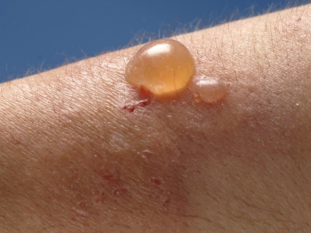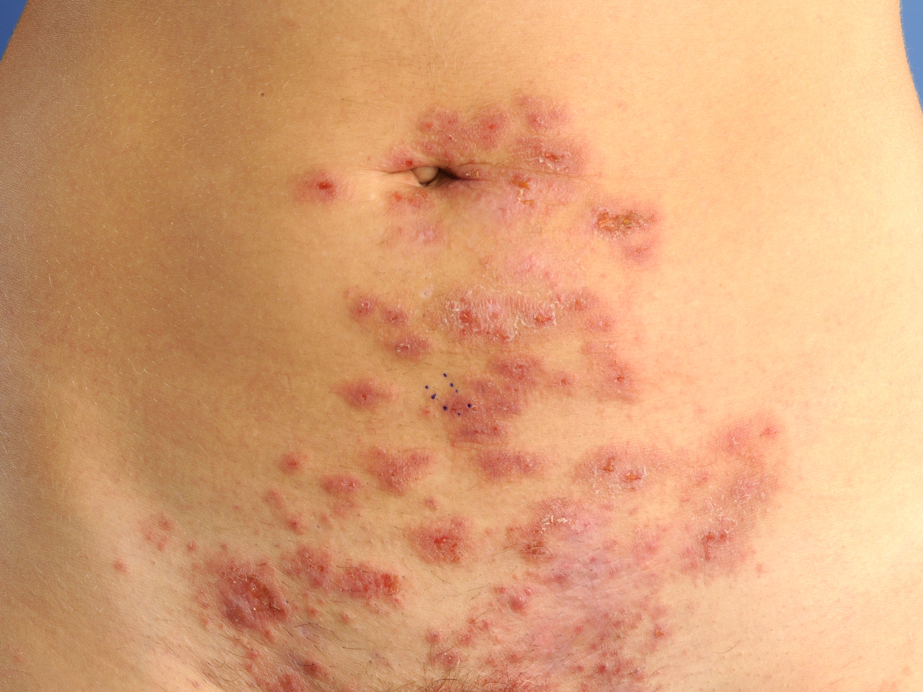 Red, itchy patches appear first, followed by vesicles and/or large blisters filled with clear fluid. The blisters are firm and do not break immediately. It usually begins on the abdomen, around the navel, and then spreads to the arms and legs. It can spread throughout the body. The oral cavity is usually not affected.