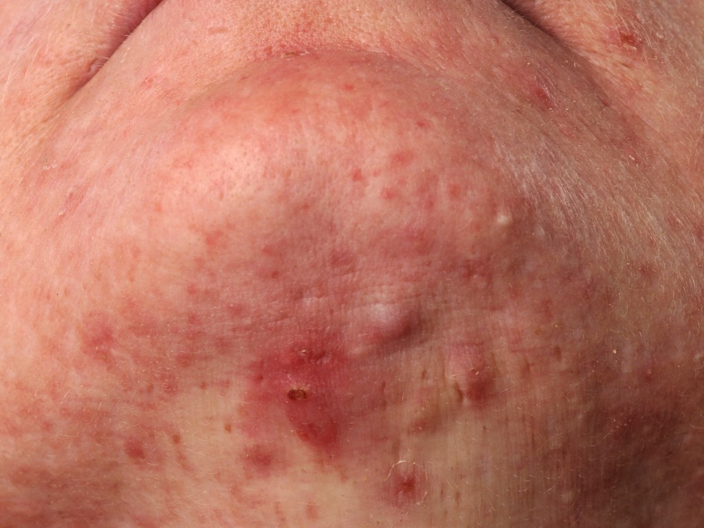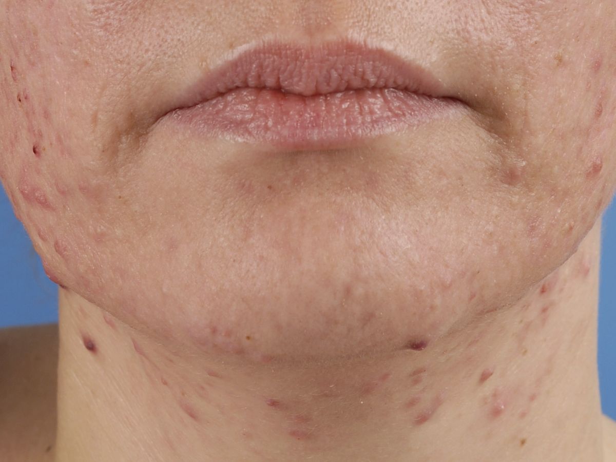 Bij late-onset acne (ontstaan na de puberteit) meestal acne van de kin en rond