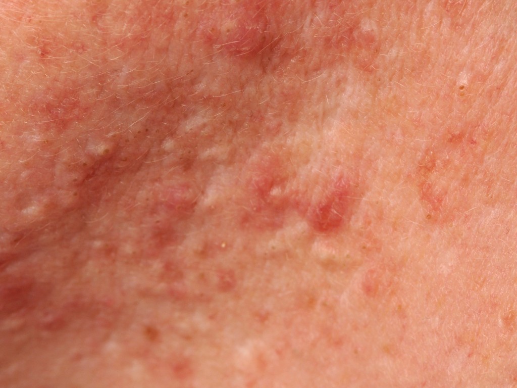 op de lagere delen van het gelaat en de hals. Vrijwel continu aanwezig met verergering