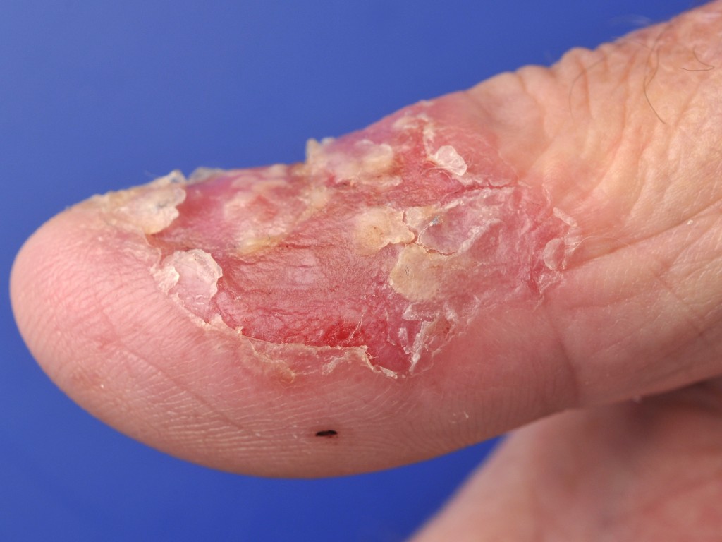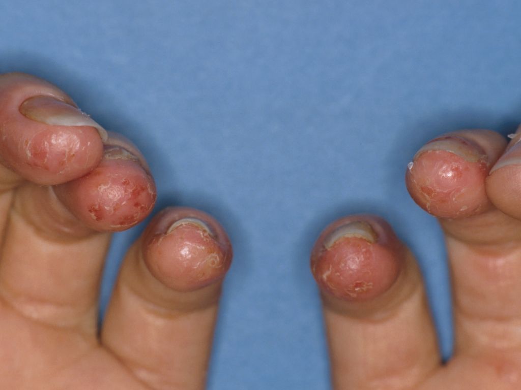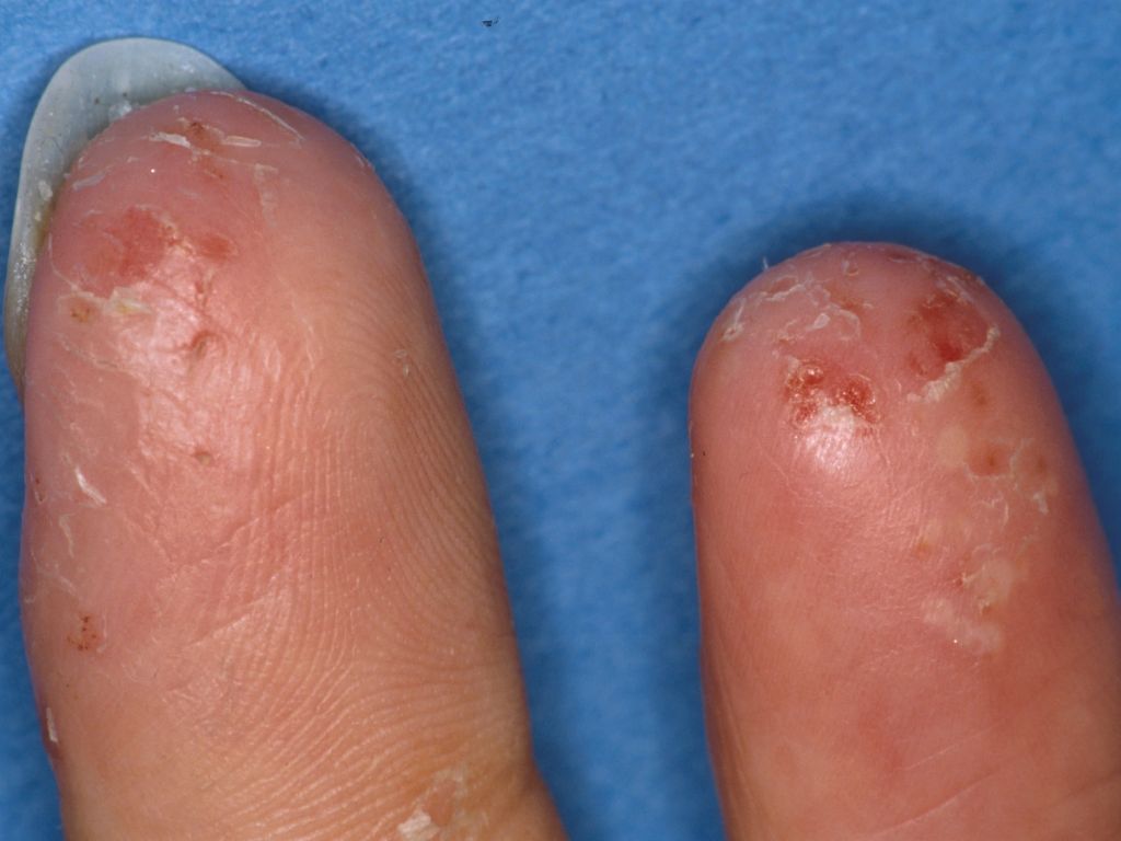 aan de acra. Begint met enkele kleine pustels aan de top van 1-2 vingers of