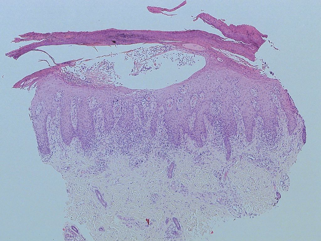 atrofische huid met daarin nieuwe pustels, of gebieden met crustae, hyperkeratose