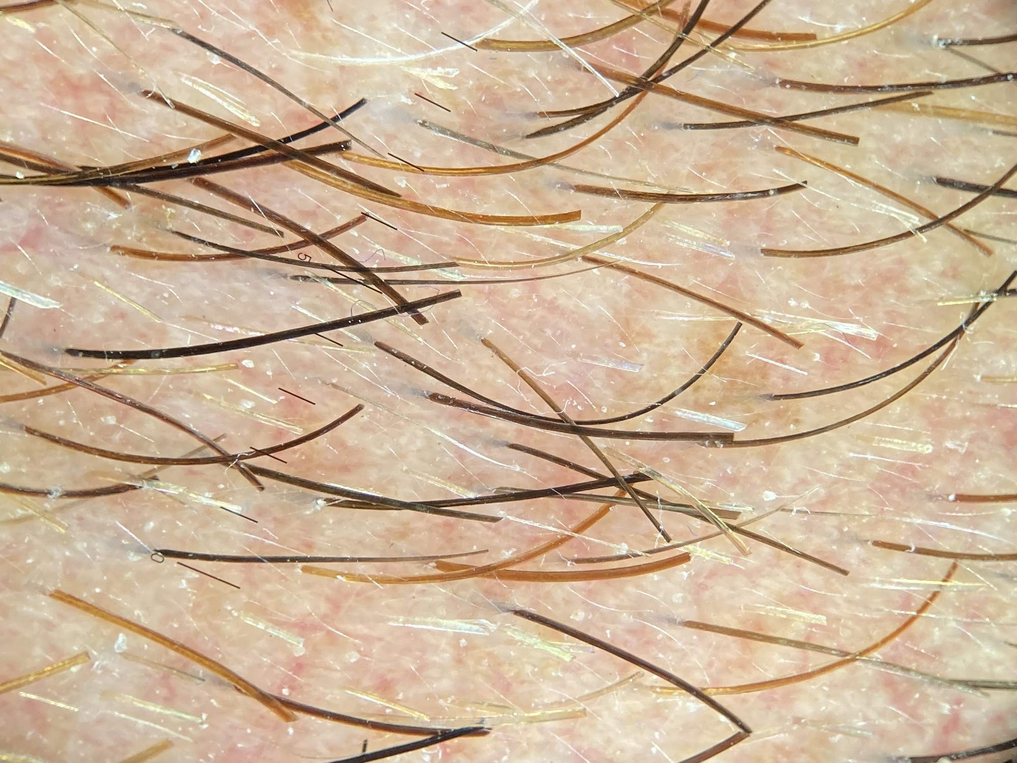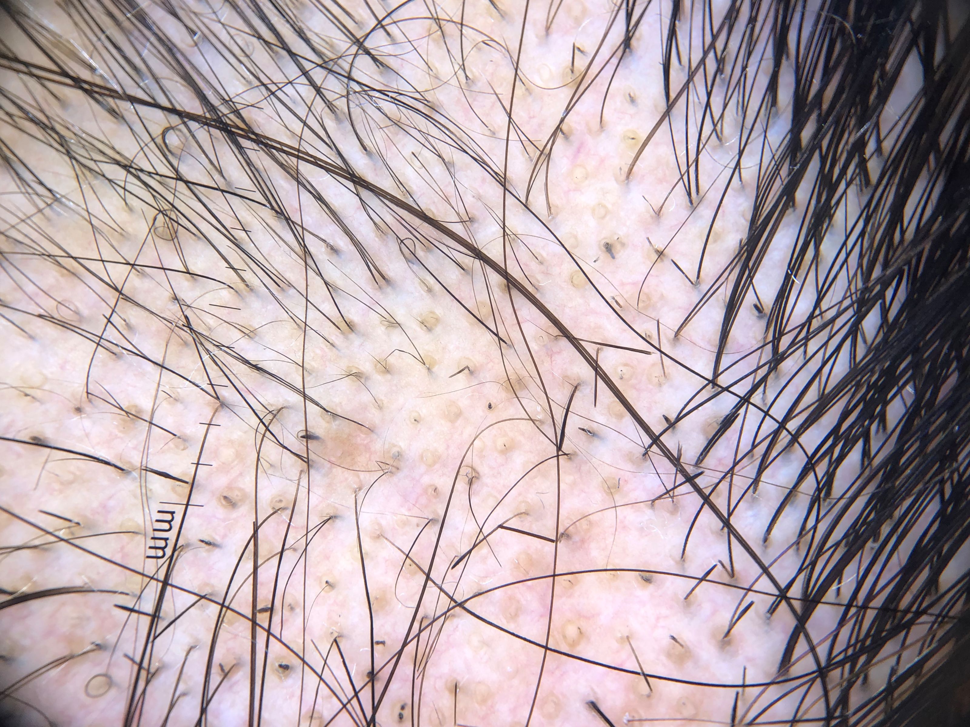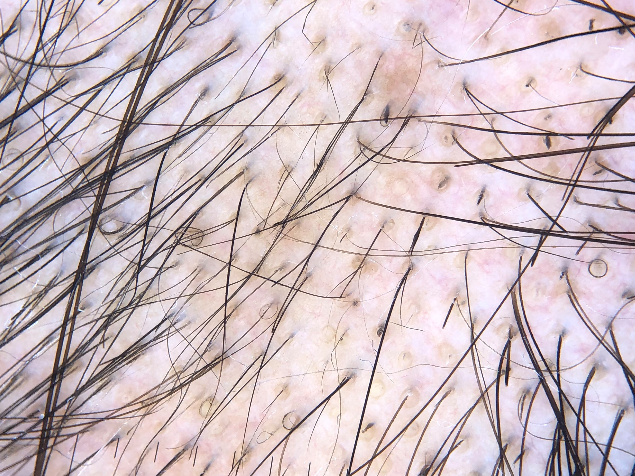 Trichoscopie:Bij actieve alopecia areata uitroeptekenharen, zwarte dots, afgebroken haren. In inactieve fase regulair gedistribueerde gele dots, verdwijnen van follikelopeningen, vellusharen. In de hergroei fase vellusharen en terminale haren, en haar- hergroei met rechtopstaande of gekrulde haren (pigtail hairs).