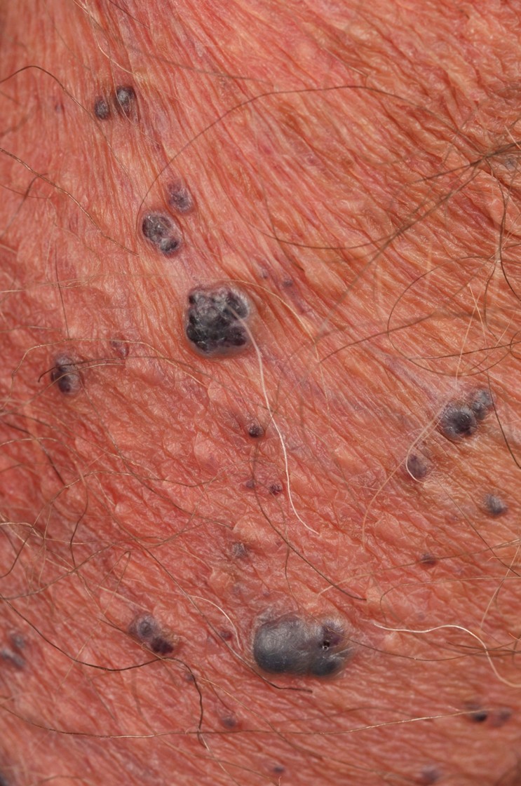 of paarsrode angiomen met hyperkeratotisch oppervlak.