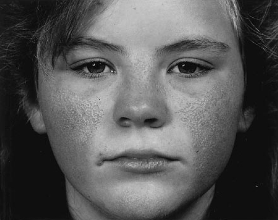 - atrophia maculosa varioliformis cutis (enkele putjes op de wangen