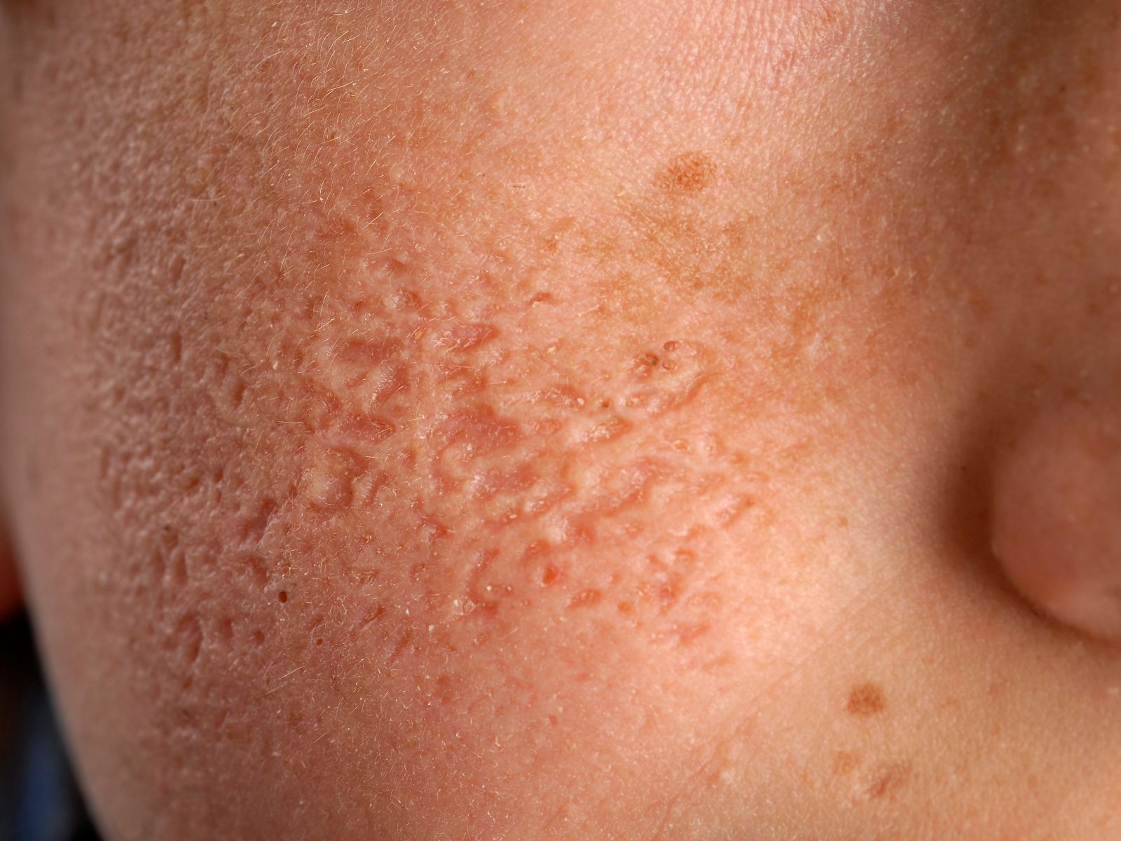 verzonken littekentjes op de wangen en/of de armen ontstaan, zonder een duidelijke