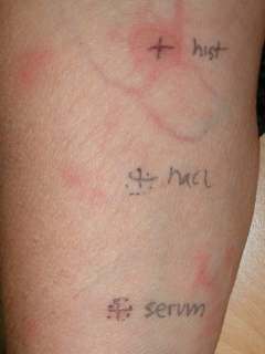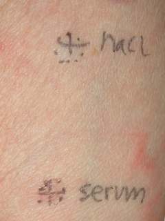 ![Testbenodigdheden: 0.05 ml histamine, NaCl en serum van de patient (click on photo to enlarge) [source: www.huidziekten.nl] testbenodigdheden: 0.05 ml histamine, NaCl en serum van de patient](../../../images/urtserumskintestz.jpg) |