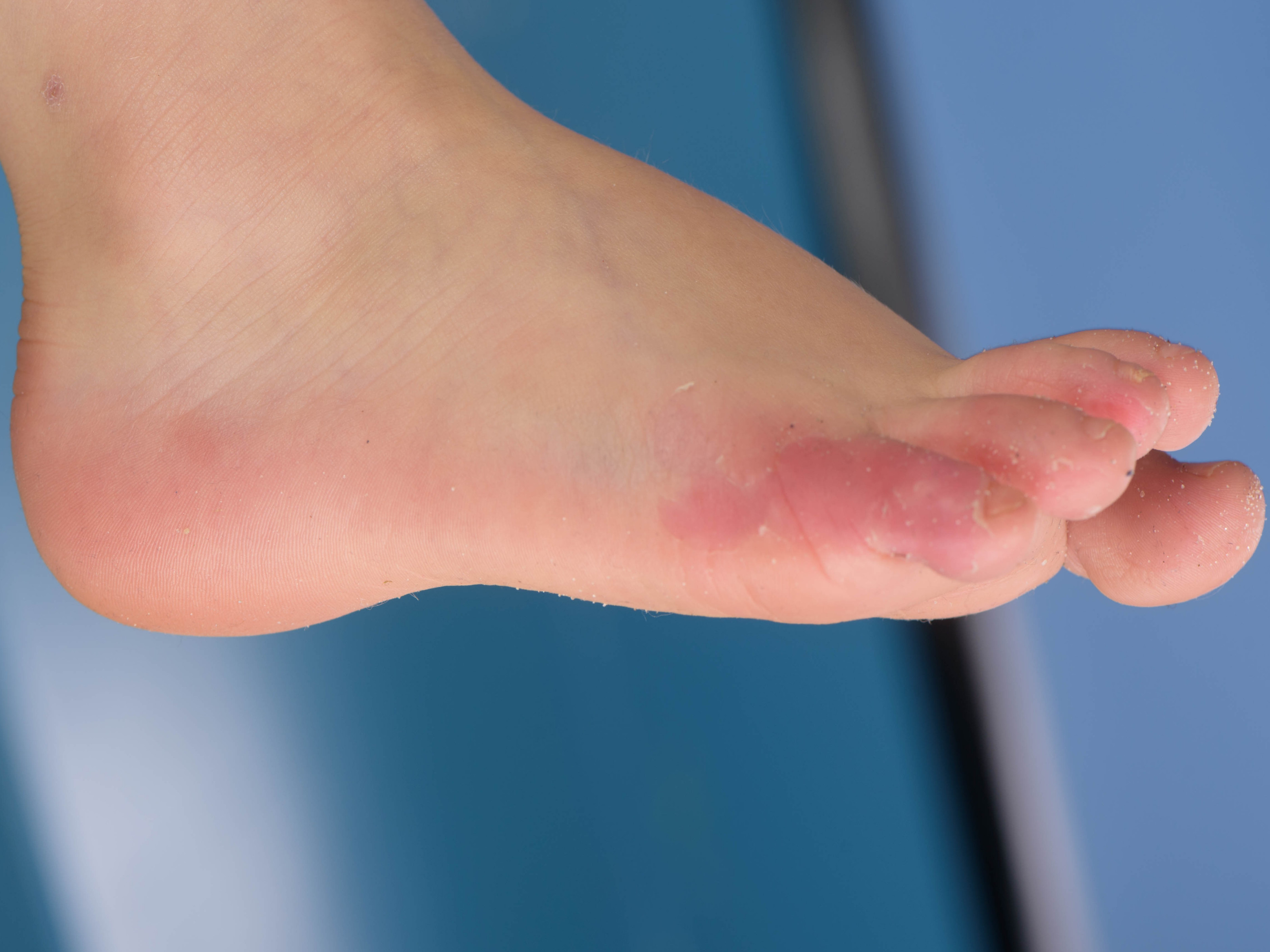 loslating van de epidermis (peeling) aan de handen en voeten. Meestal aan de
