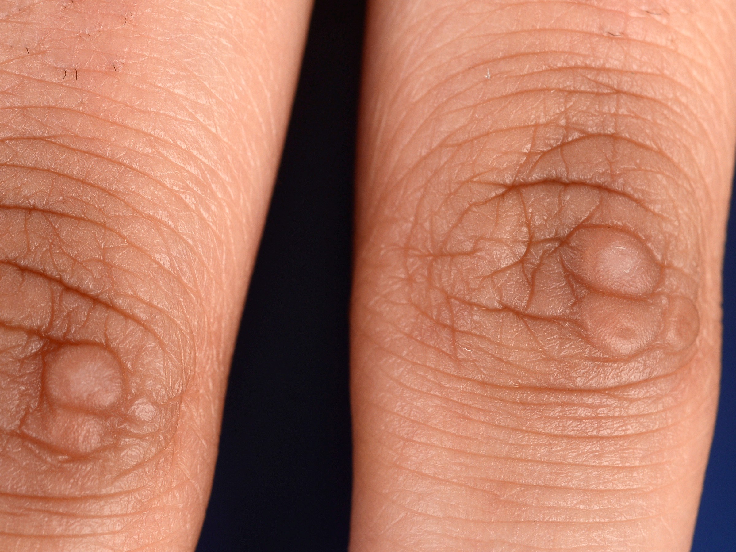 symptomen, huidkleurige of gelige hyperkeratotische papeltjes, verschijnen vanaf