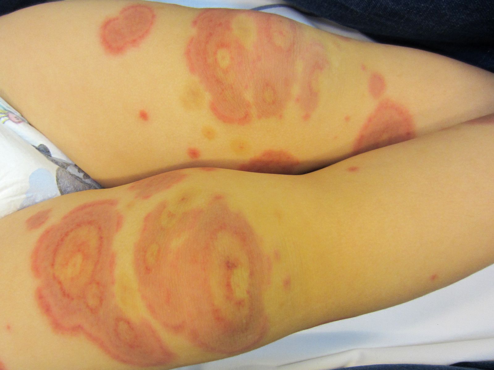extremiteiten) en purpura (aanvankelijk urticarieel, annulair, target lesions,