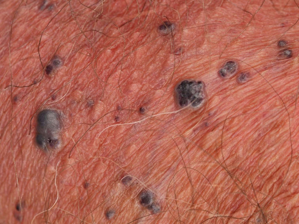 kleine paarsrode noduli, papels of plaques, soms met verruceus oppervlak.