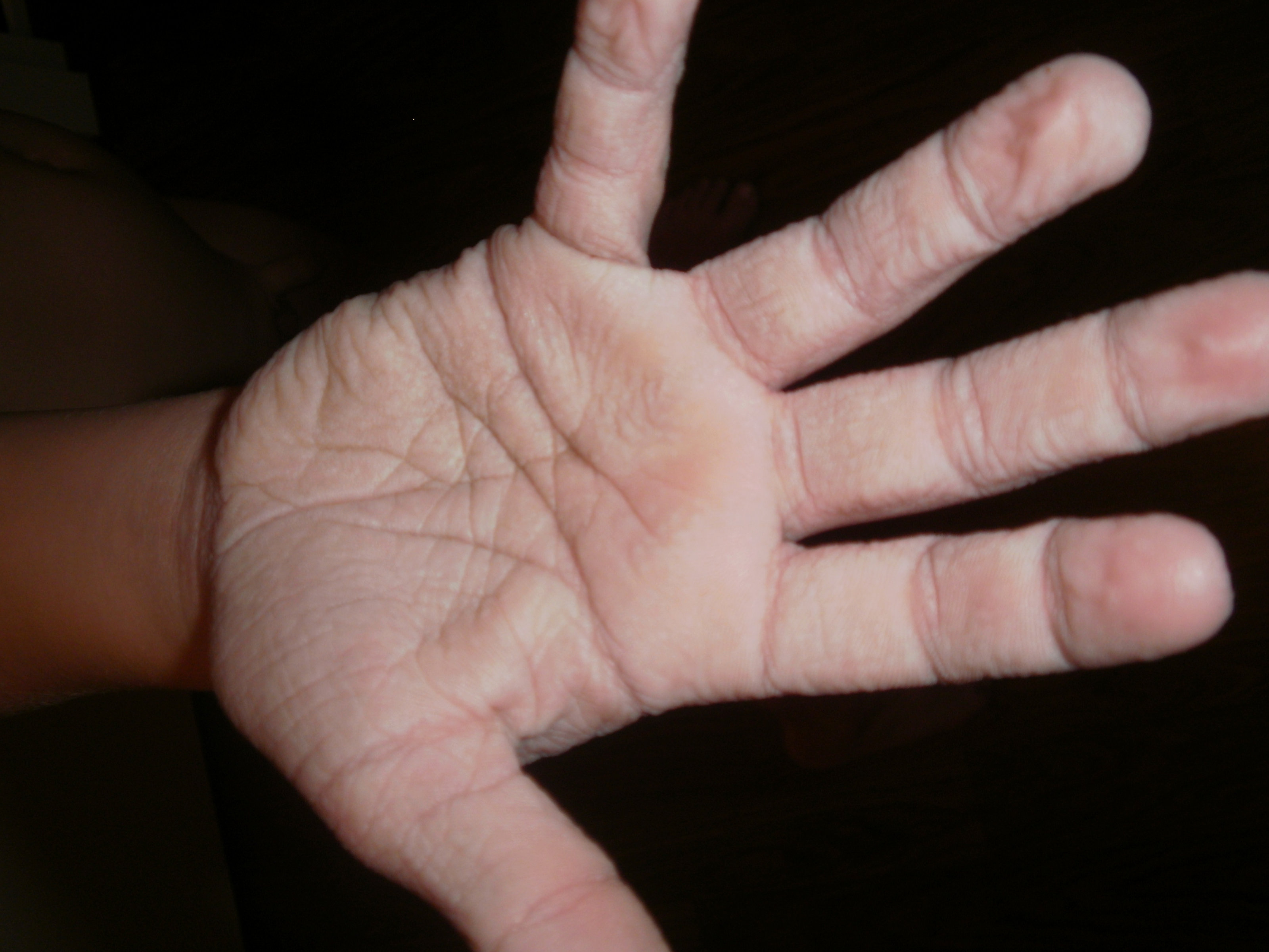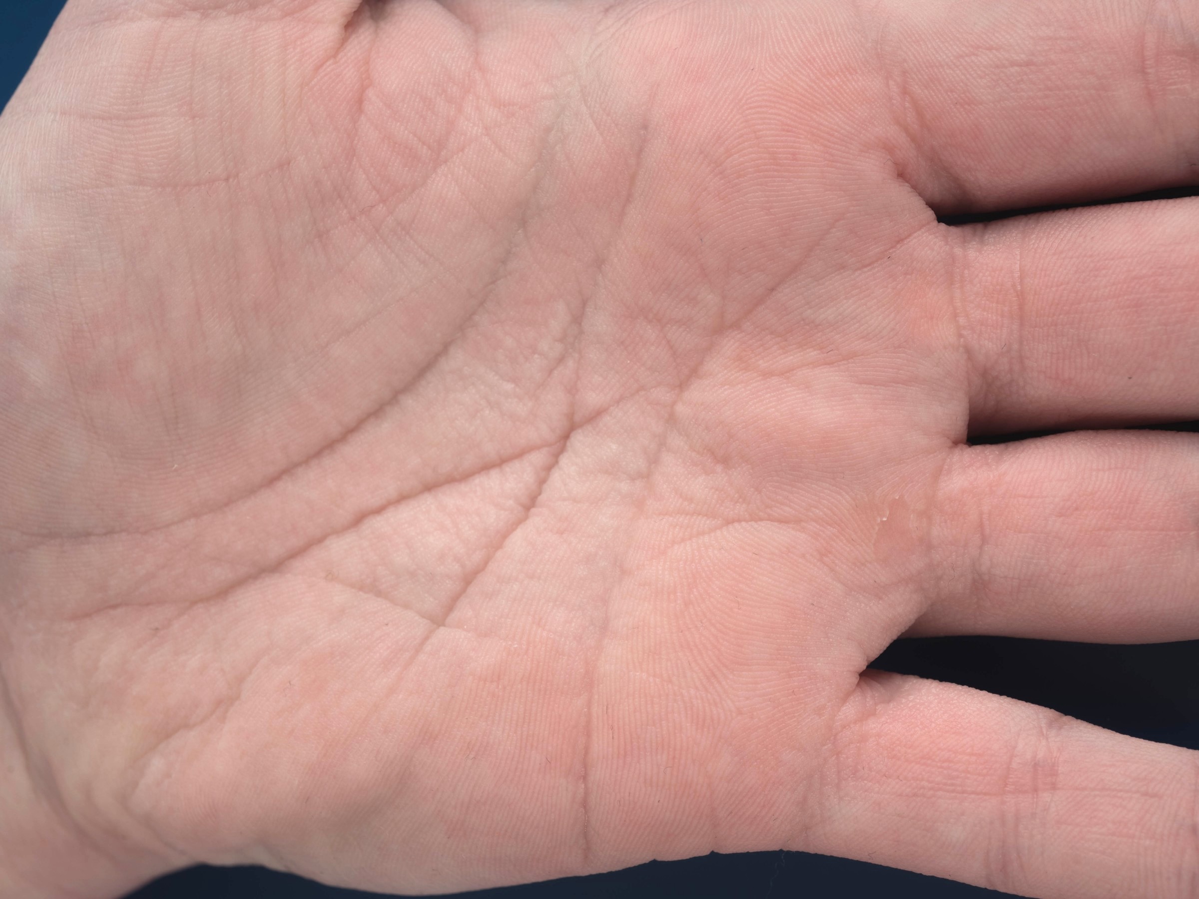 Het klinisch beeld wisselt. Bij sommige patiënten zien de handpalmen er wit