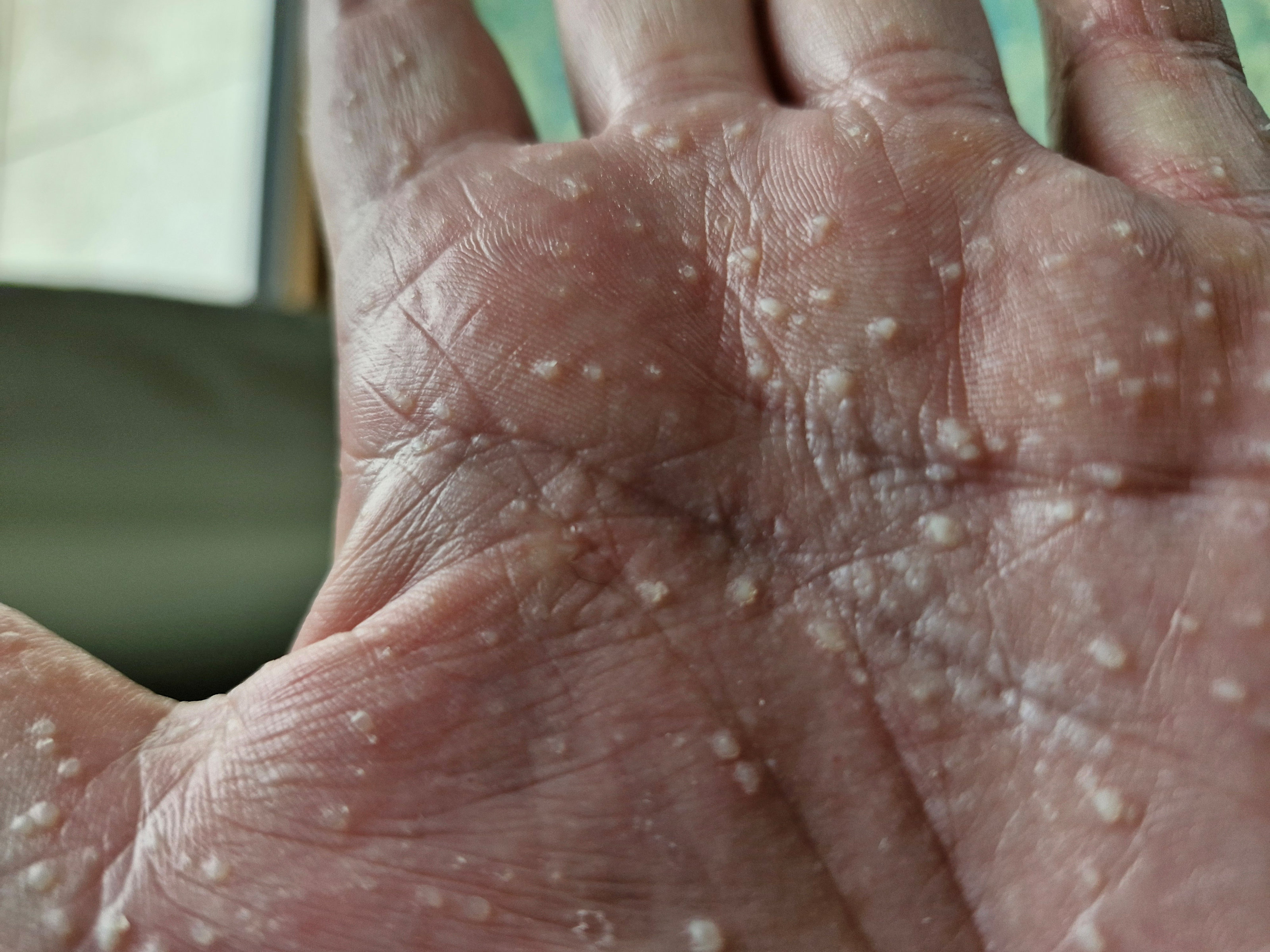 huid, of doorzichtige witte of gelige papels of plaques op de handpalmen,