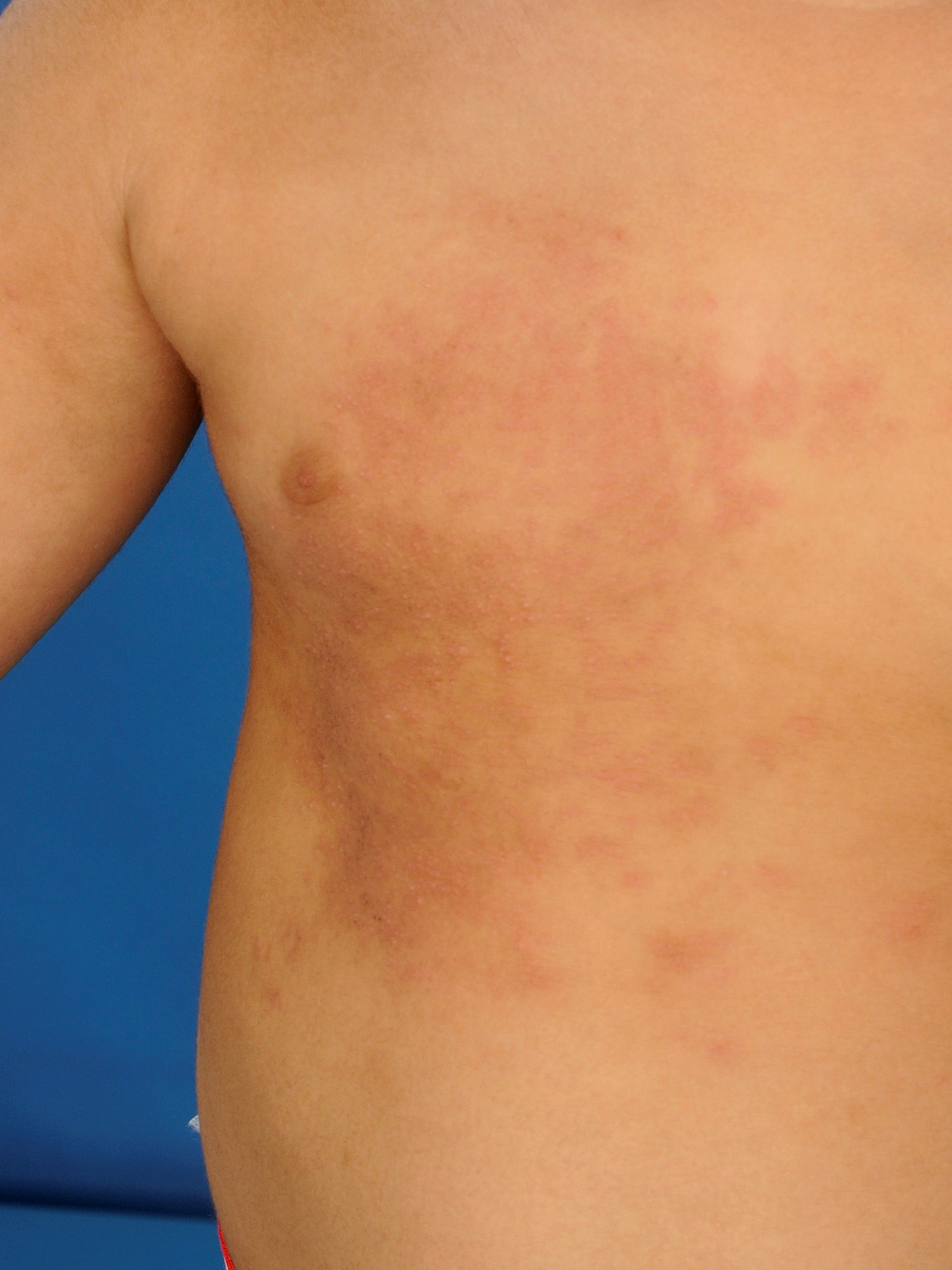 eruptie, beginnend in de oksel of liesplooi, later centrifugaal uitbreidend