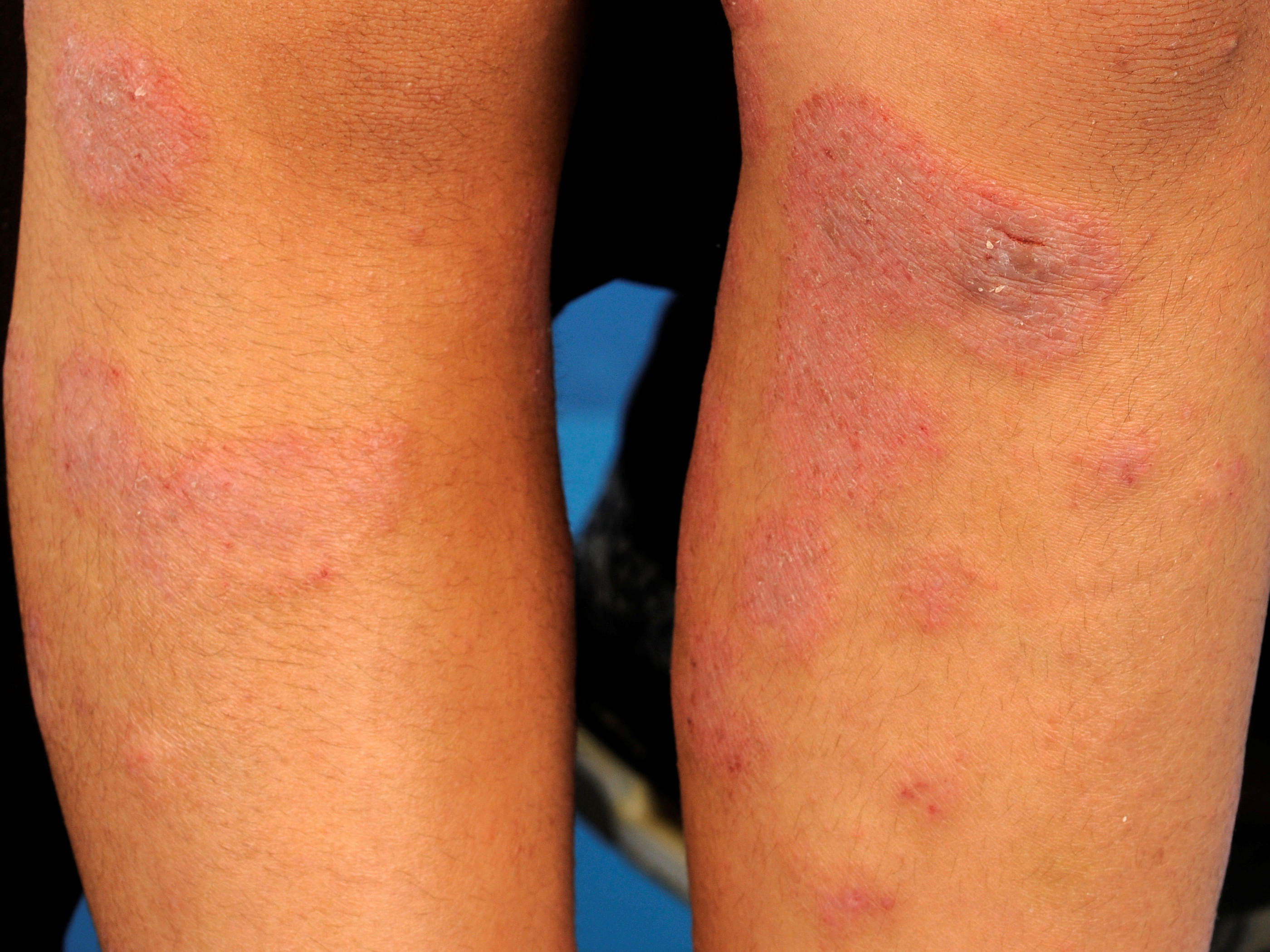 de strekzijde van de extremiteiten en op de romp. Ook een lichen planus-achtige