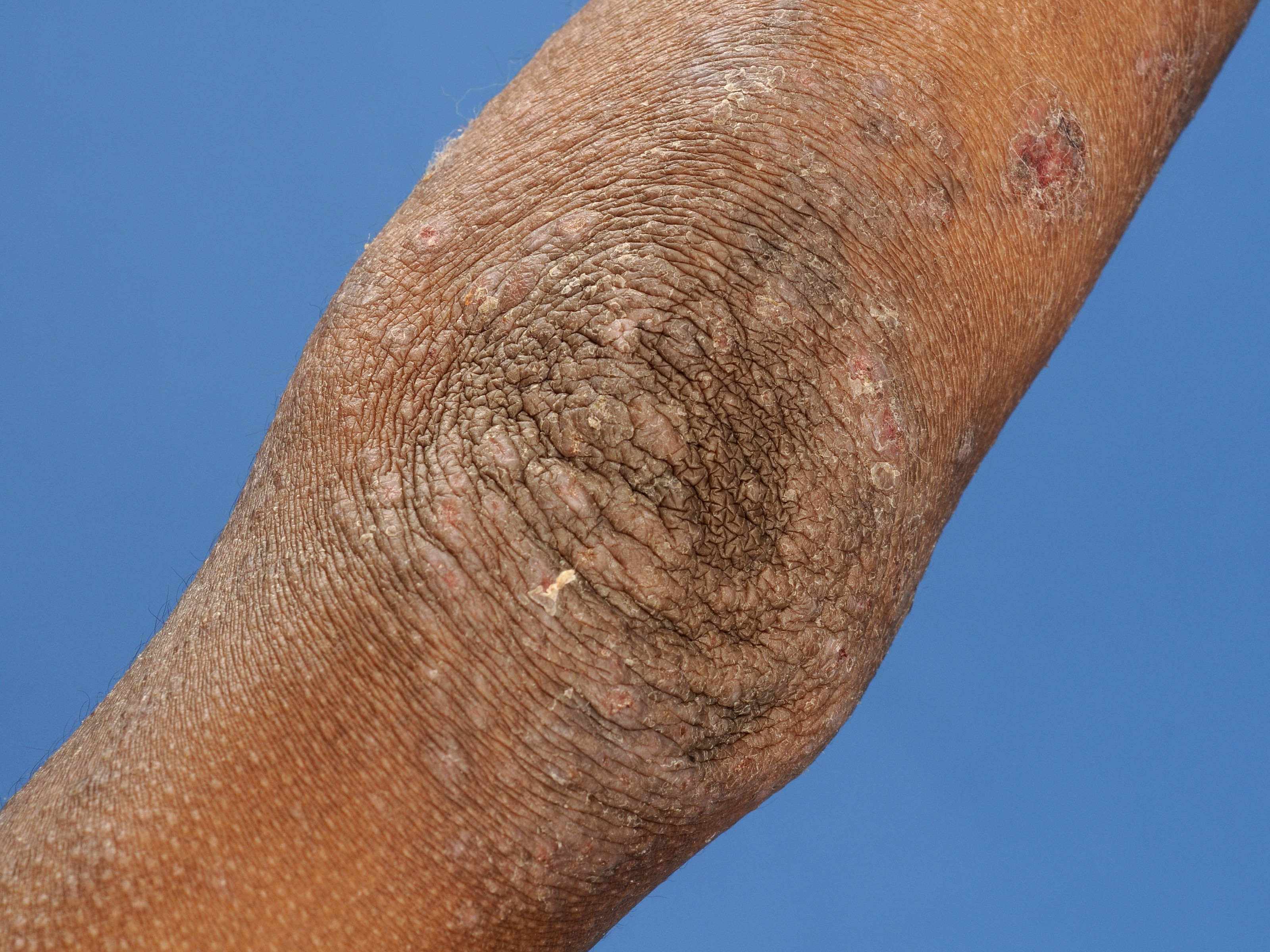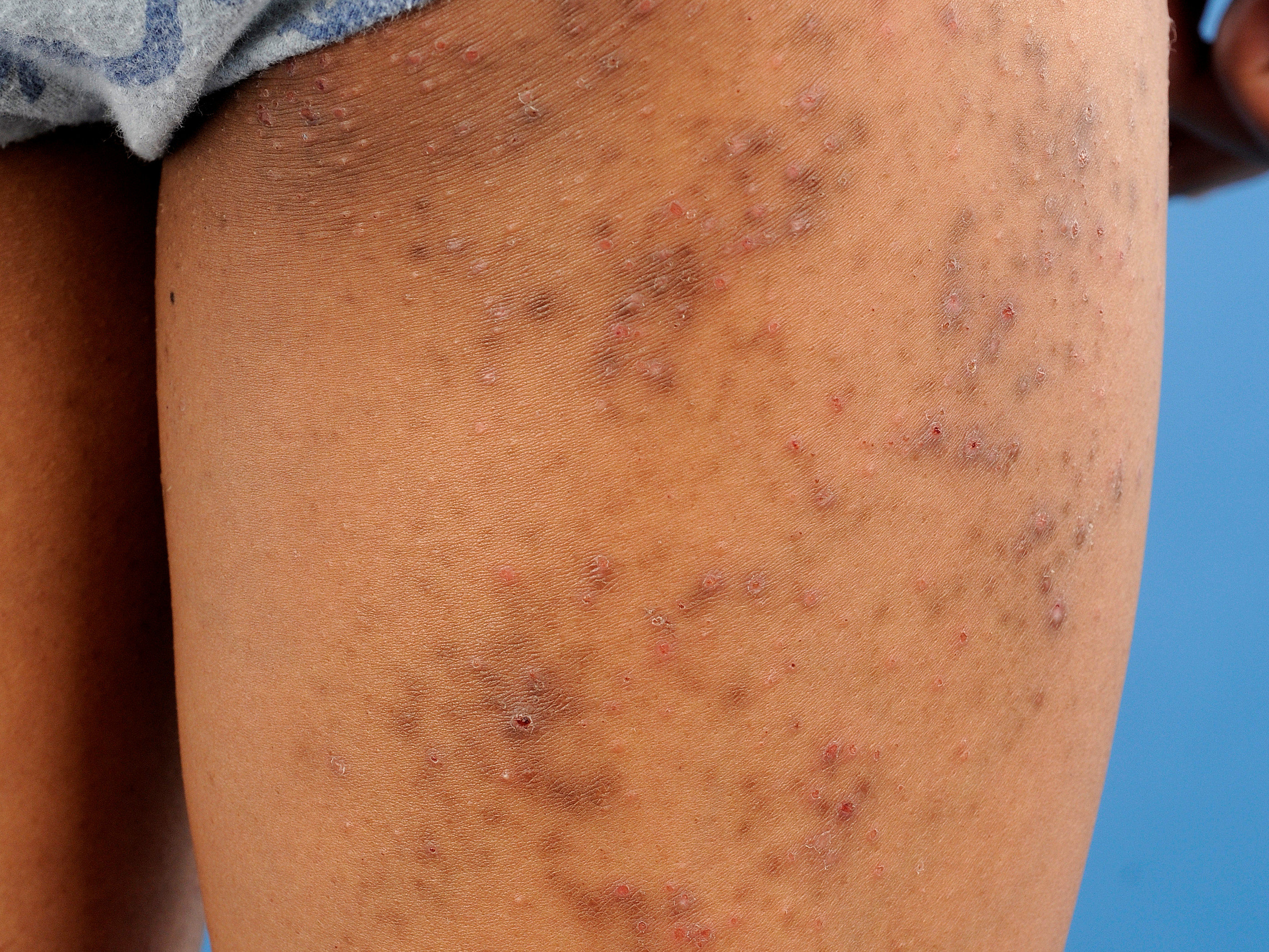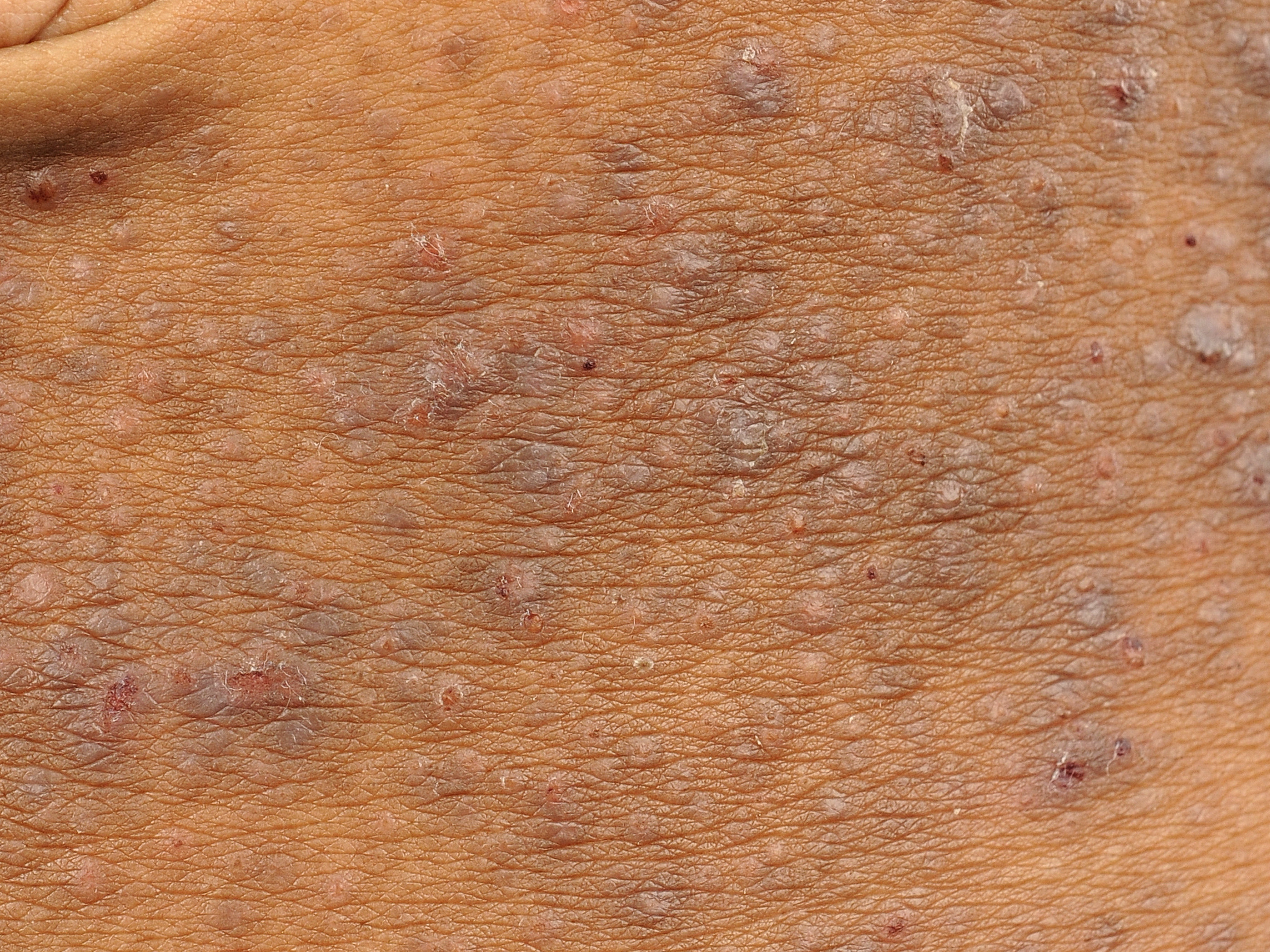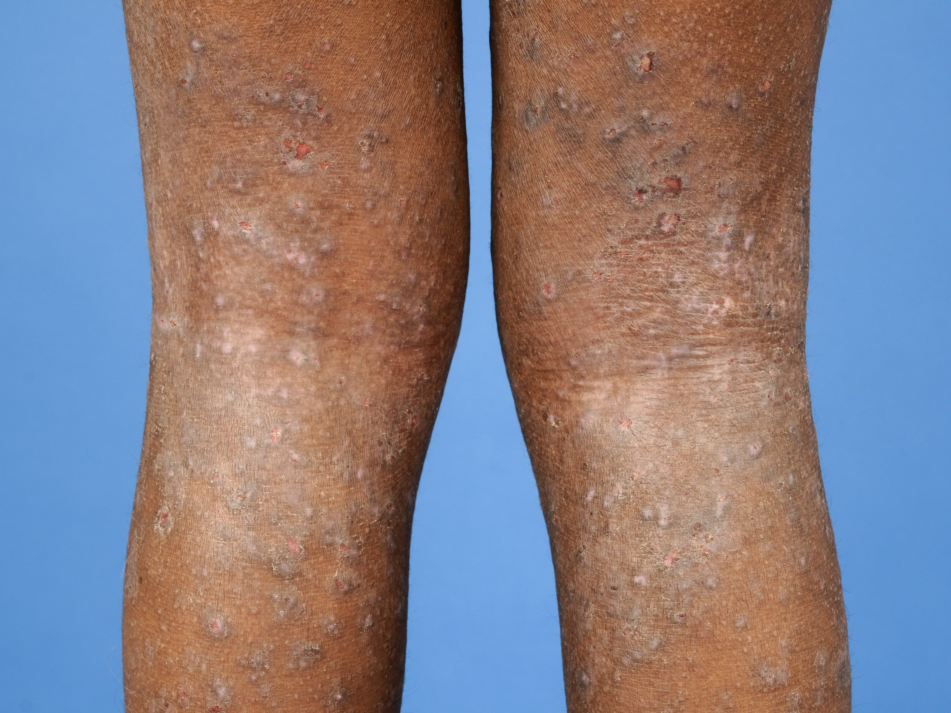 lichenificatie - vaker prurigo nodularis - jeukende, gehyperpigmenteerde