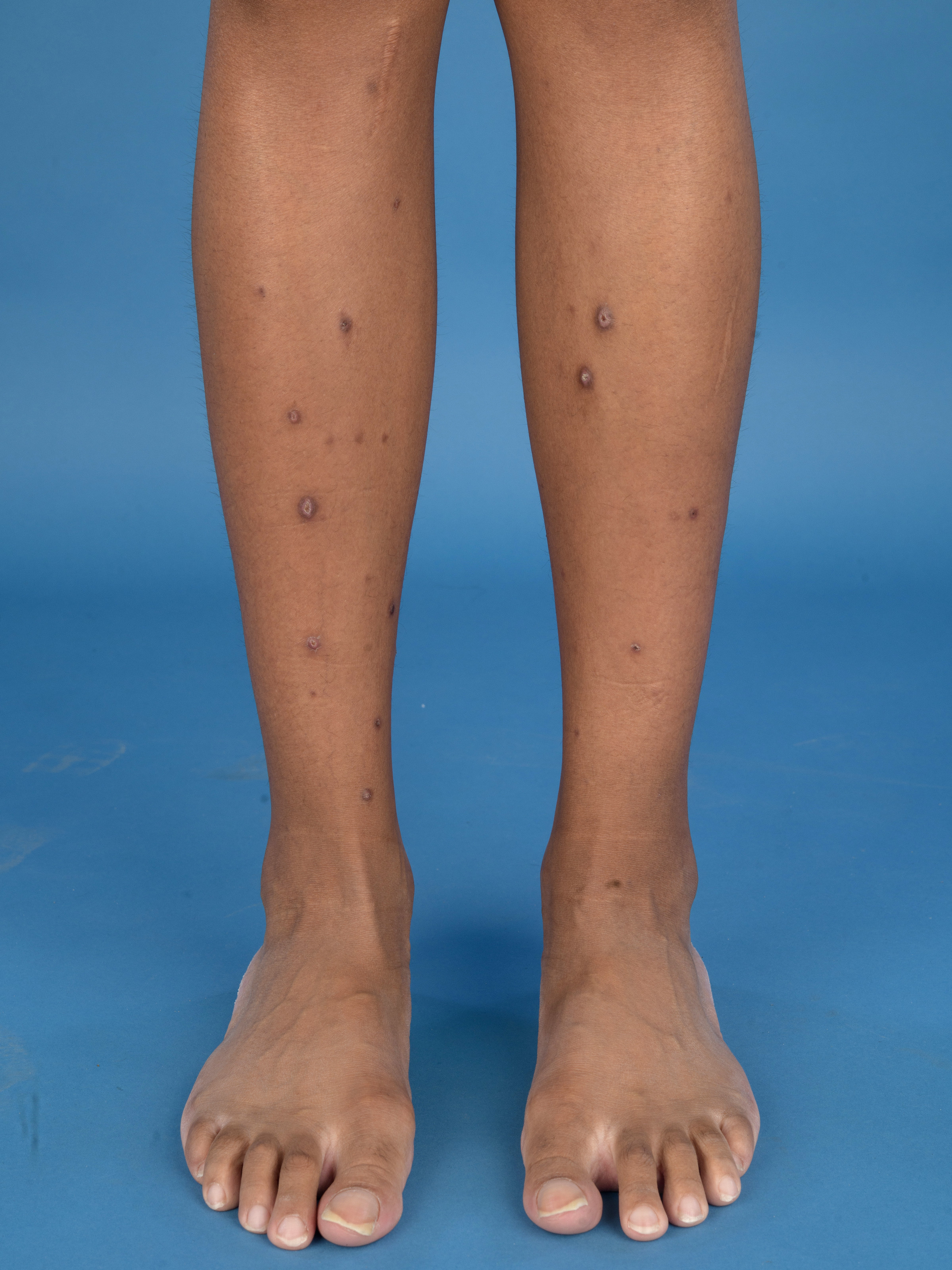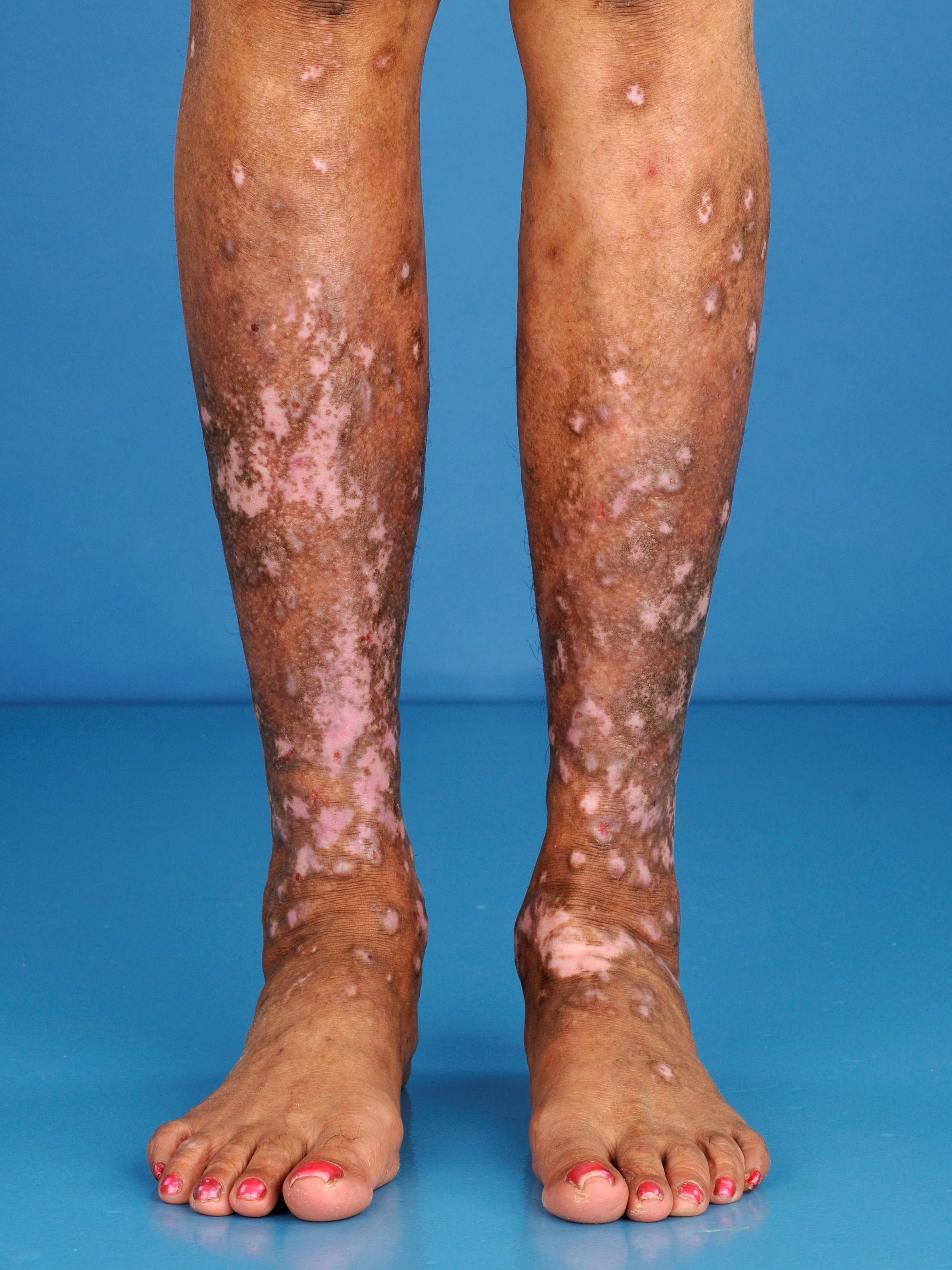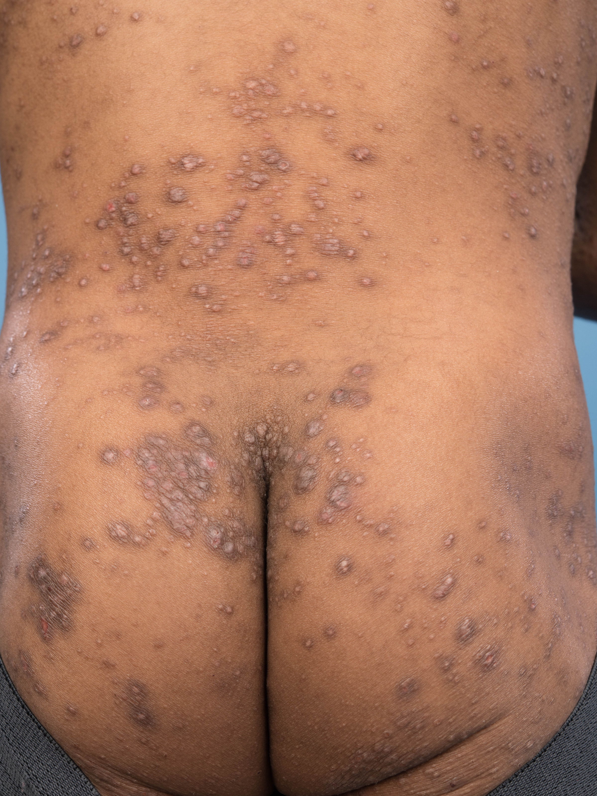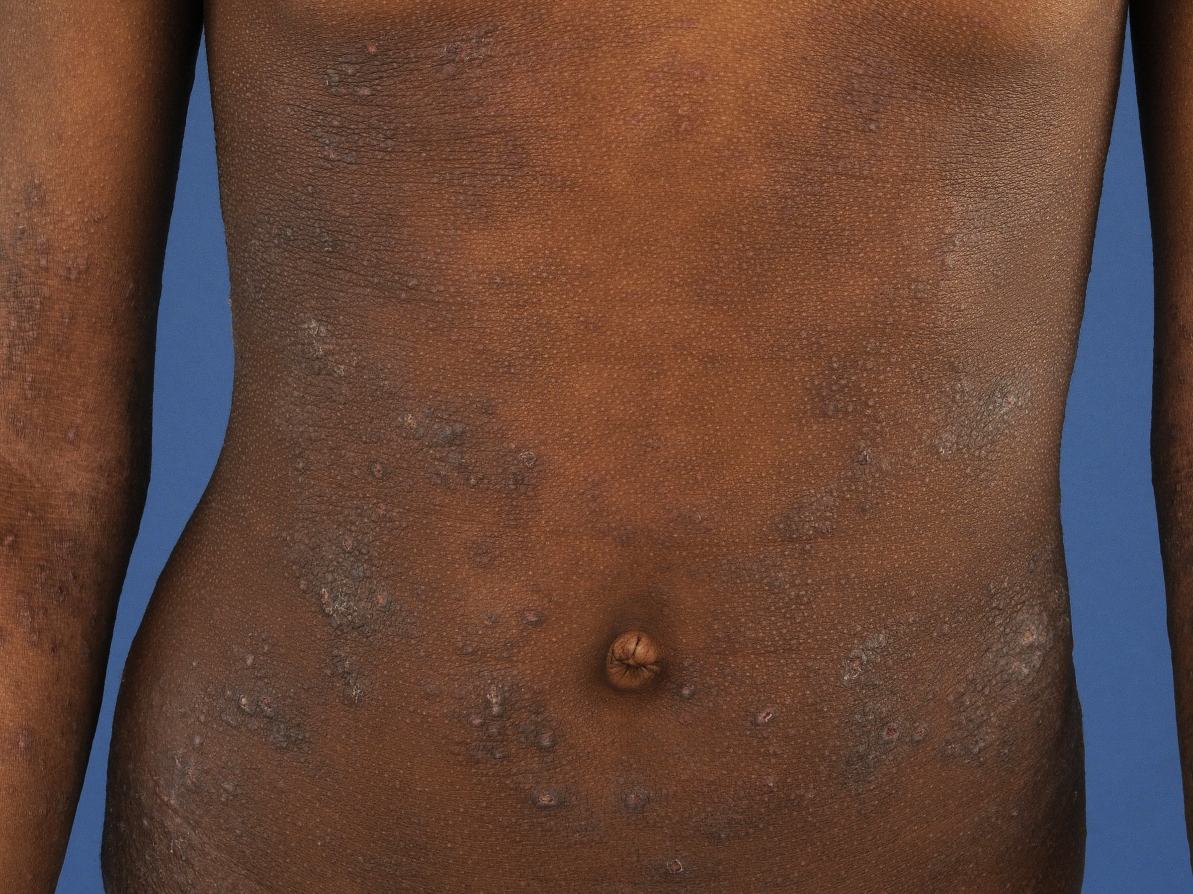 lichenificatie - vaker prurigo nodularis - jeukende, gehyperpigmenteerde